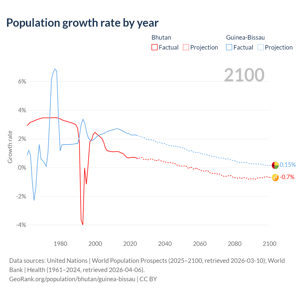 - For the last 10 years, Bhutan has had an average growth rate of +0.8% per year vs +2.4% in Guinea-Bissau.