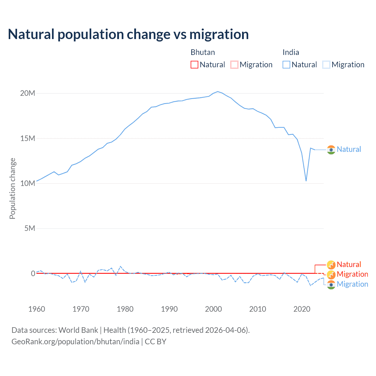 Over the last 10 years, 93.3% of the population change in Bhutan is from natural causes (a gain of 55,796 people) and 6.74% is from migration (a gain of 4,035 people). In India 96.4% is from natural causes (a gain of 145,503,378 people) and 3.56% is from migration (a loss of 5,376,884 people).