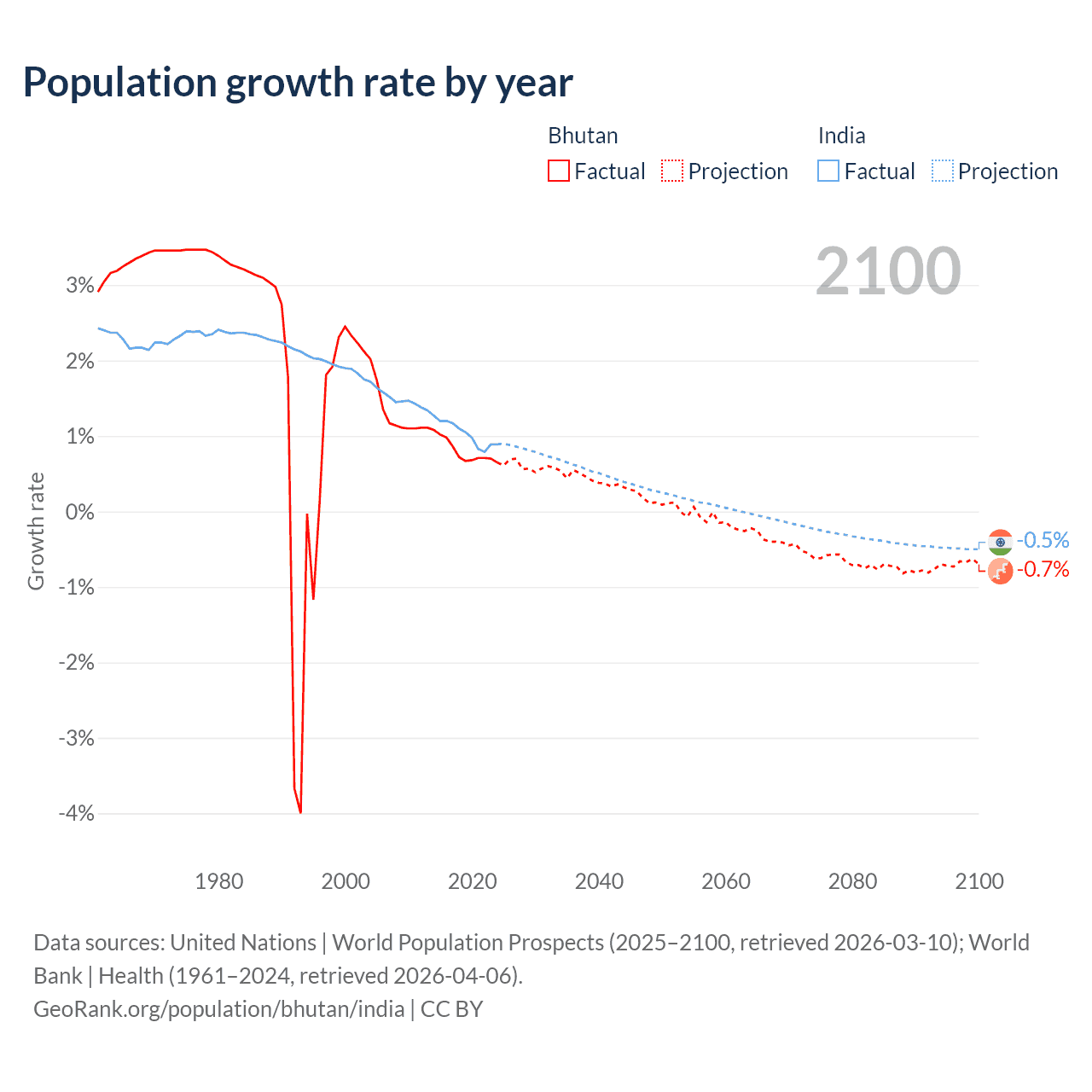 - For the last 10 years, Bhutan has had an average growth rate of +0.8% per year vs +1.03% in India.