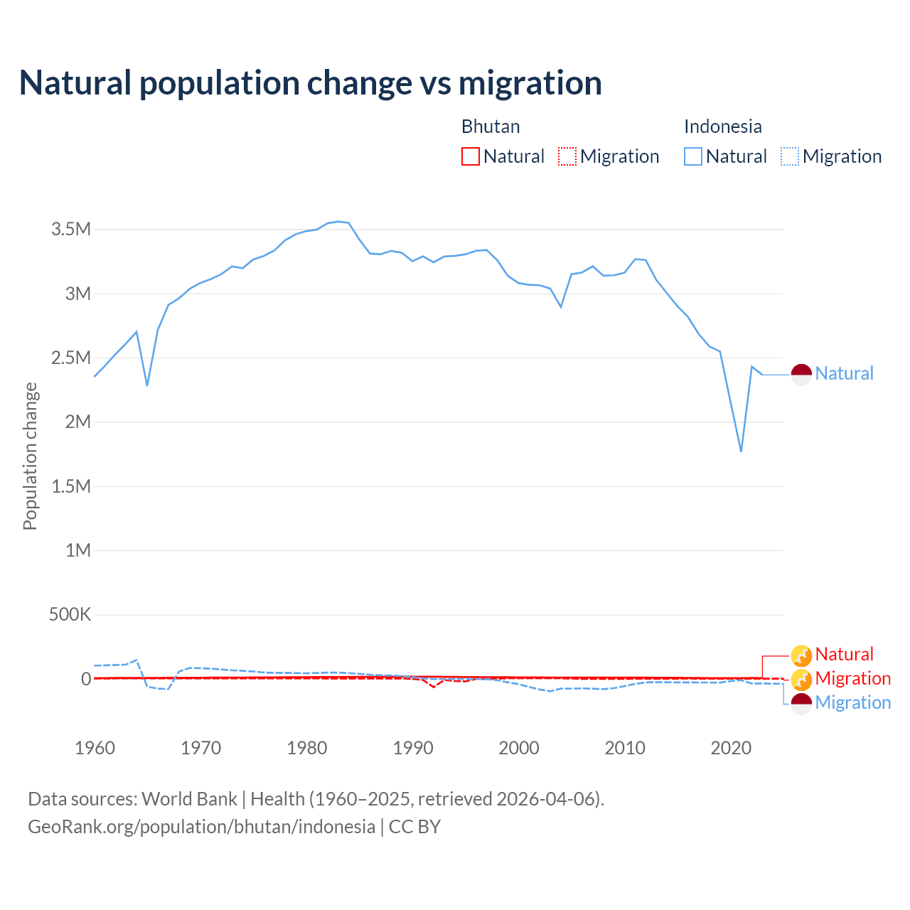 Over the last 10 years, 93.3% of the population change in Bhutan is from natural causes (a gain of 55,796 people) and 6.74% is from migration (a gain of 4,035 people). In Indonesia 98.9% is from natural causes (a gain of 25,242,860 people) and 1.1% is from migration (a loss of 280,258 people).