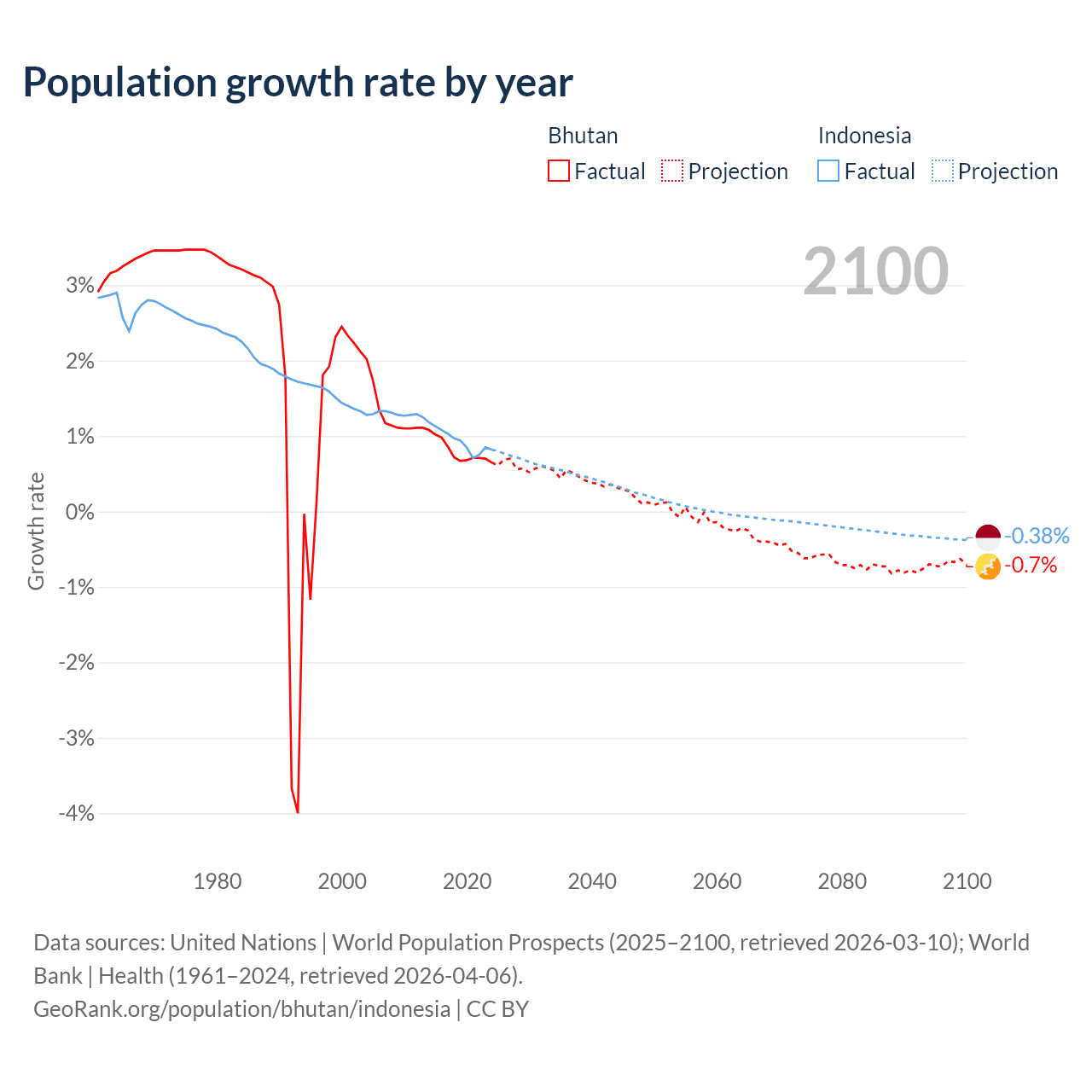 - For the last 10 years, Bhutan has had an average growth rate of +0.8% per year vs +0.94% in Indonesia.