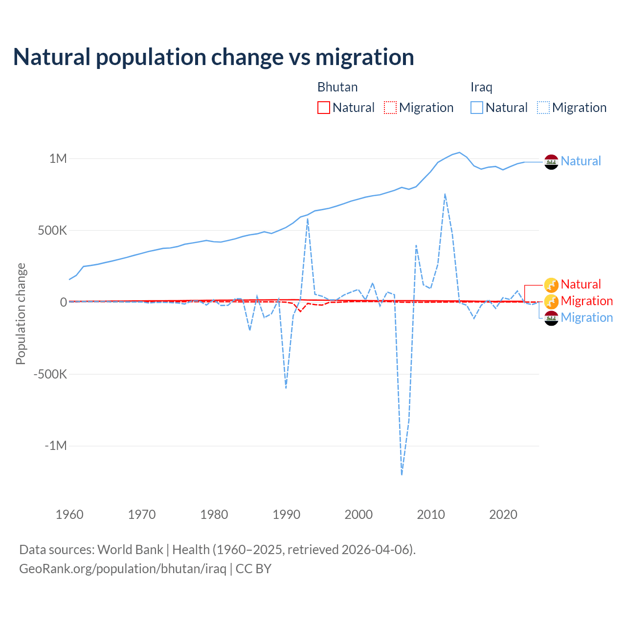 Over the last 10 years, 93.3% of the population change in Bhutan is from natural causes (a gain of 55,796 people) and 6.74% is from migration (a gain of 4,035 people). In Iraq 99.2% is from natural causes (a gain of 9,598,842 people) and 0.76% is from migration (a loss of 73,050 people).