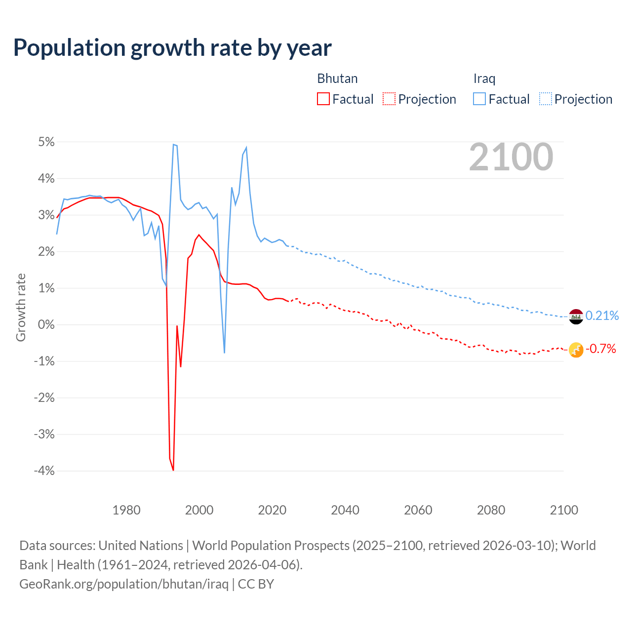 - For the last 10 years, Bhutan has had an average growth rate of +0.8% per year vs +2.45% in Iraq.