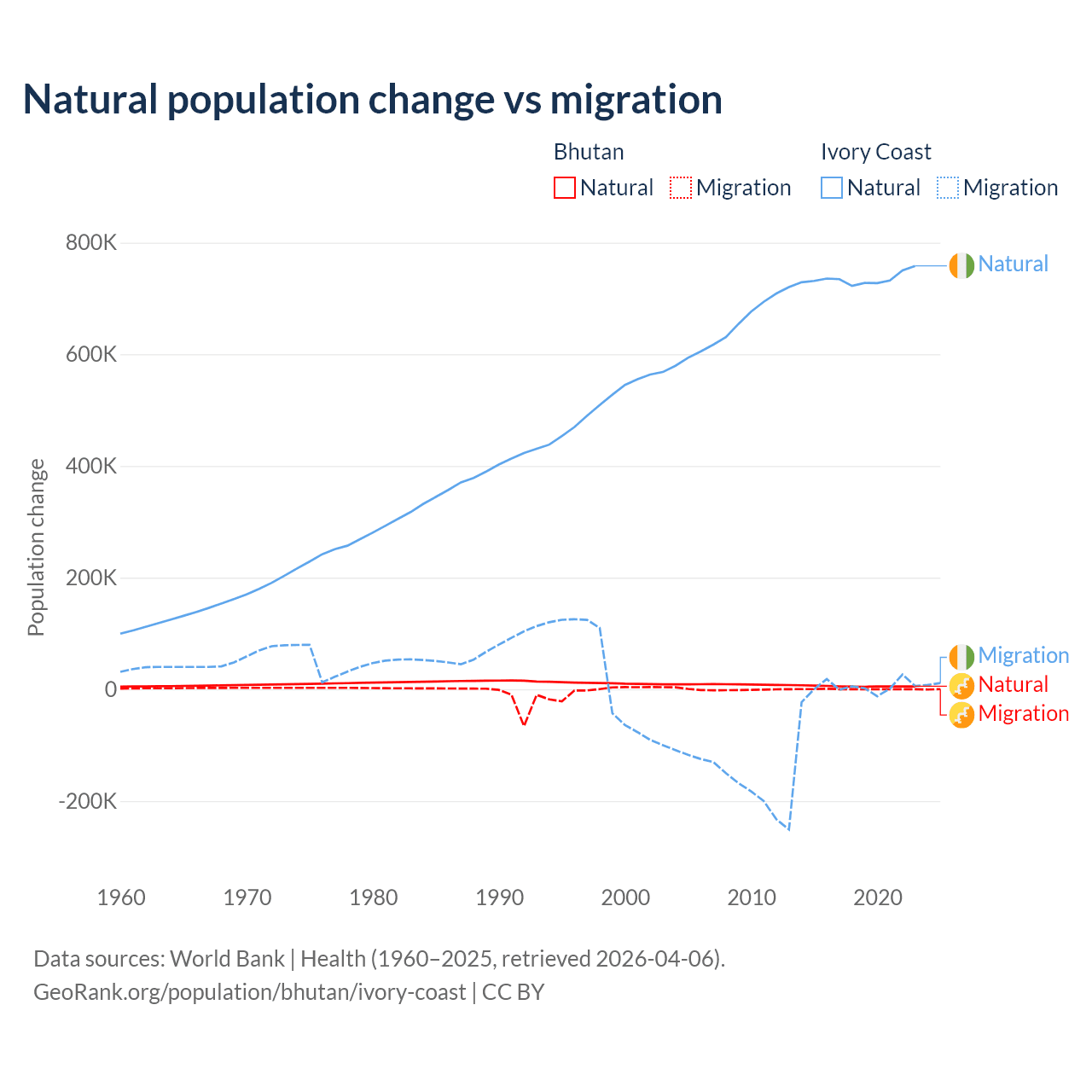 Over the last 10 years, 93.3% of the population change in Bhutan is from natural causes (a gain of 55,796 people) and 6.74% is from migration (a gain of 4,035 people). In Ivory Coast 99.7% is from natural causes (a gain of 7,348,944 people) and 0.33% is from migration (a gain of 24,432 people).