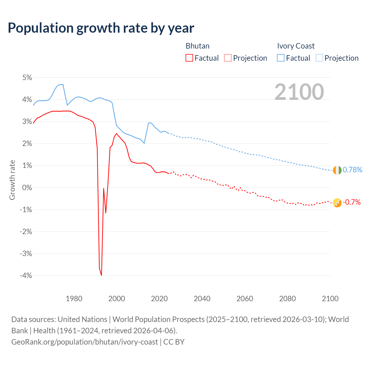 - For the last 10 years, Bhutan has had an average growth rate of +0.8% per year vs +2.65% in Ivory Coast.