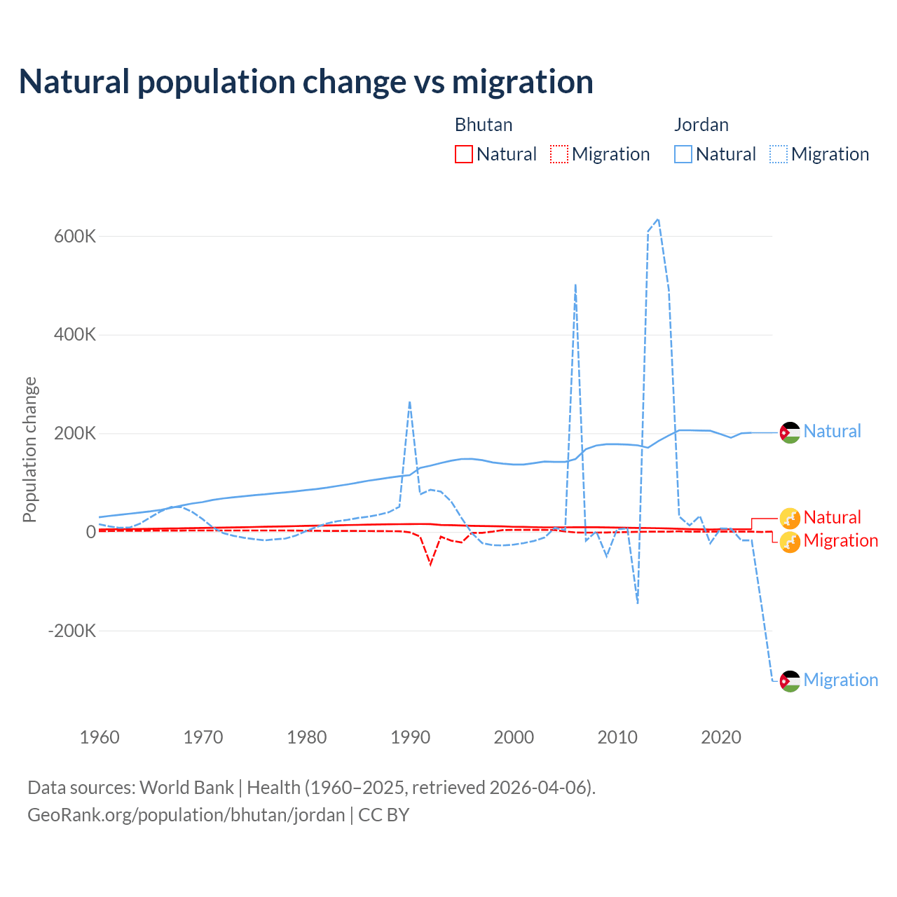Over the last 10 years, 93.3% of the population change in Bhutan is from natural causes (a gain of 55,796 people) and 6.74% is from migration (a gain of 4,035 people). In Jordan 63.2% is from natural causes (a gain of 1,991,452 people) and 36.8% is from migration (a gain of 1,157,625 people).