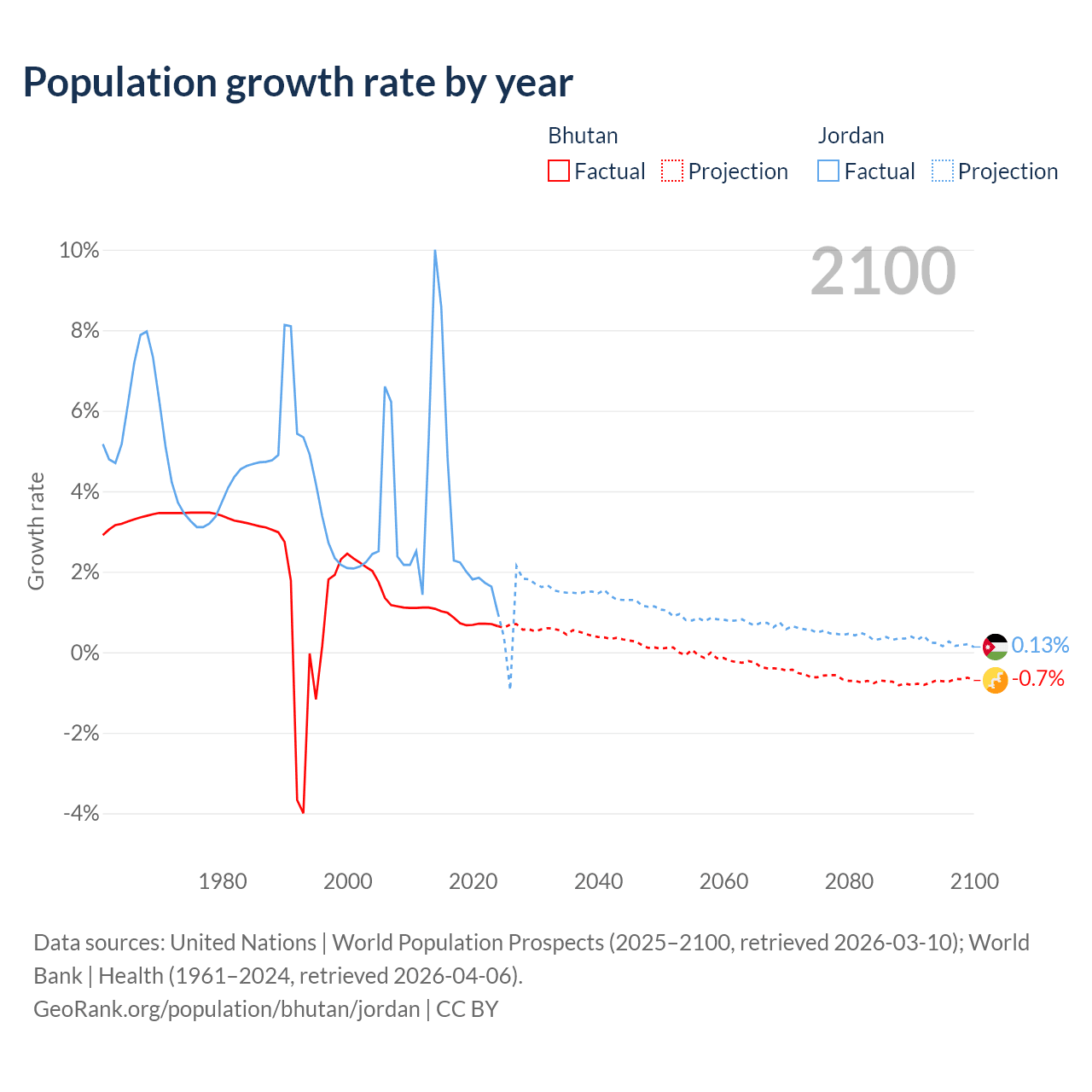 - For the last 10 years, Bhutan has had an average growth rate of +0.8% per year vs +3.45% in Jordan.