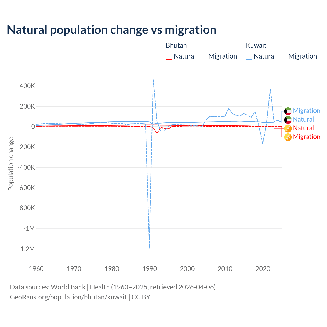 Over the last 10 years, 93.3% of the population change in Bhutan is from natural causes (a gain of 55,796 people) and 6.74% is from migration (a gain of 4,035 people). In Kuwait 35.8% is from natural causes (a gain of 470,645 people) and 64.2% is from migration (a gain of 845,142 people).