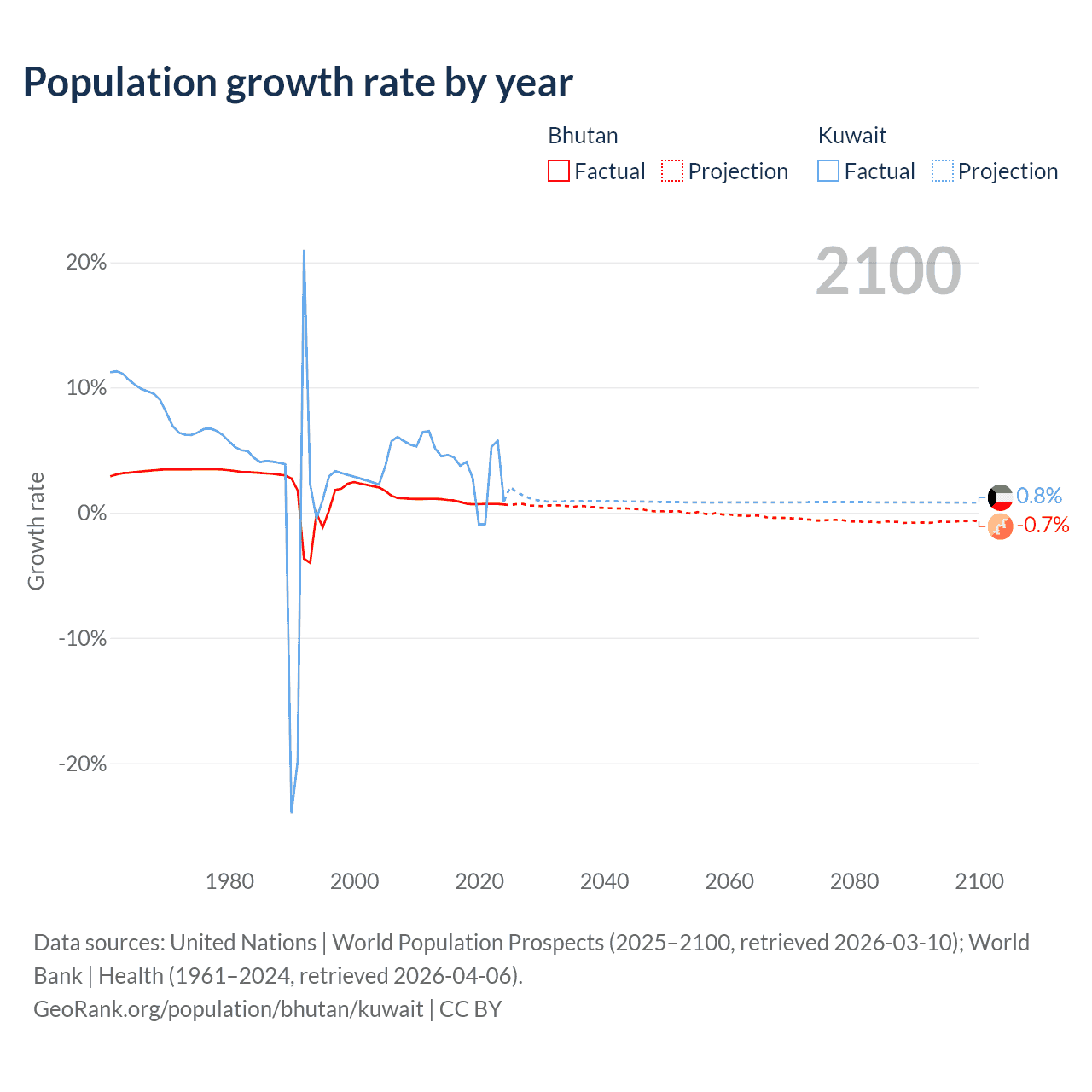 - For the last 10 years, Bhutan has had an average growth rate of +0.8% per year vs +3.1% in Kuwait.