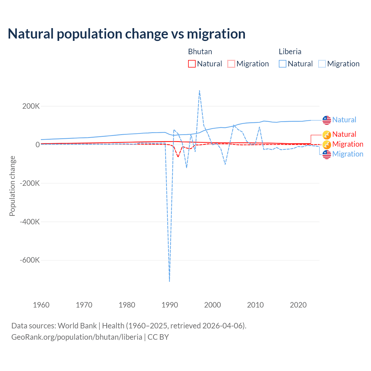 Over the last 10 years, 93.3% of the population change in Bhutan is from natural causes (a gain of 55,796 people) and 6.74% is from migration (a gain of 4,035 people). In Liberia 87.7% is from natural causes (a gain of 1,202,387 people) and 12.3% is from migration (a loss of 168,316 people).