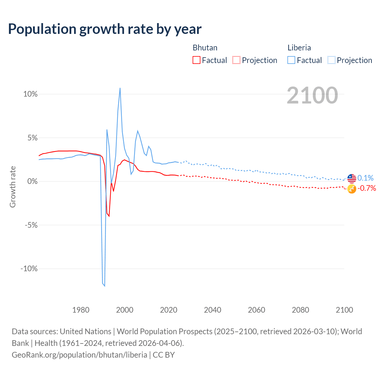 - For the last 10 years, Bhutan has had an average growth rate of +0.8% per year vs +2.09% in Liberia.