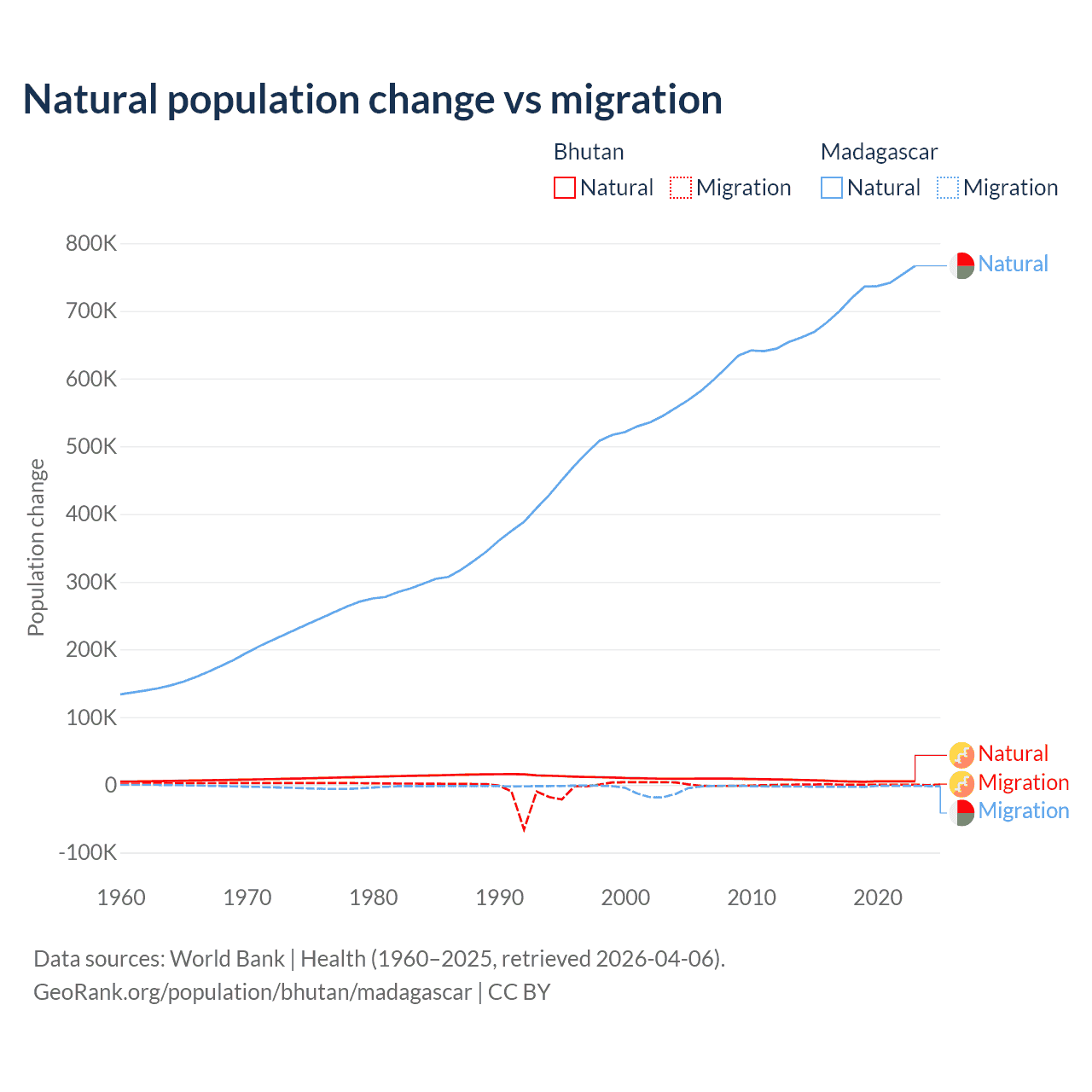 Over the last 10 years, 93.3% of the population change in Bhutan is from natural causes (a gain of 55,796 people) and 6.74% is from migration (a gain of 4,035 people). In Madagascar 99.7% is from natural causes (a gain of 7,165,578 people) and 0.31% is from migration (a loss of 22,384 people).