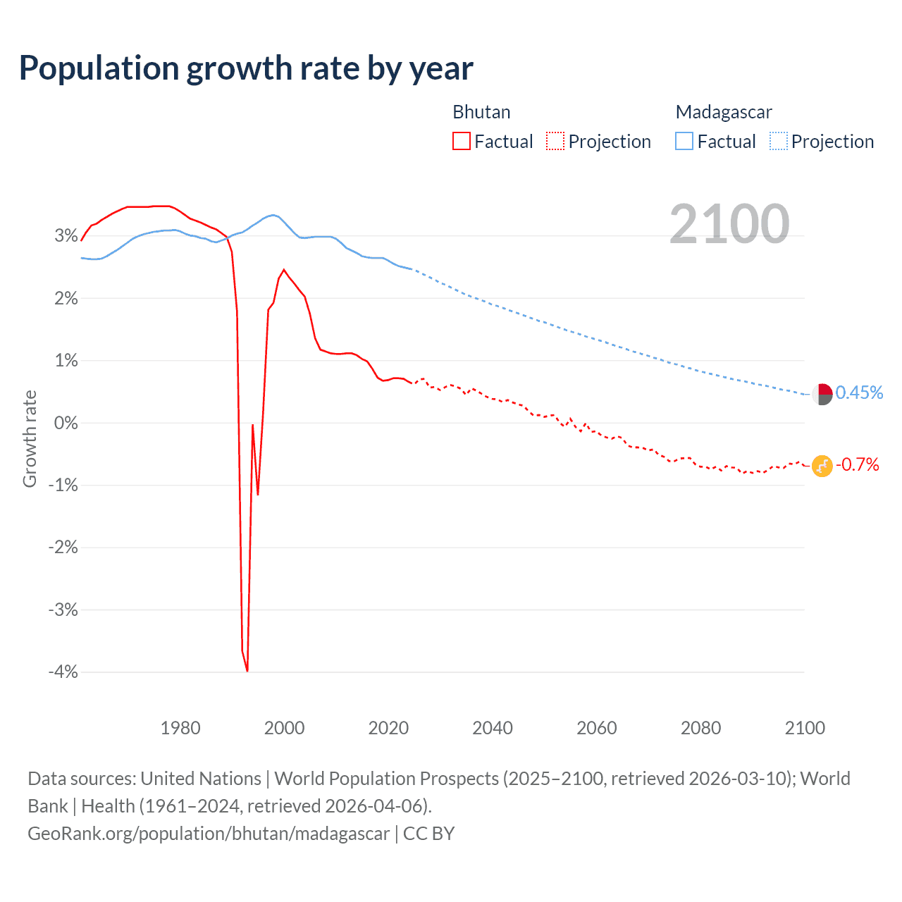 - For the last 10 years, Bhutan has had an average growth rate of +0.8% per year vs +2.6% in Madagascar.