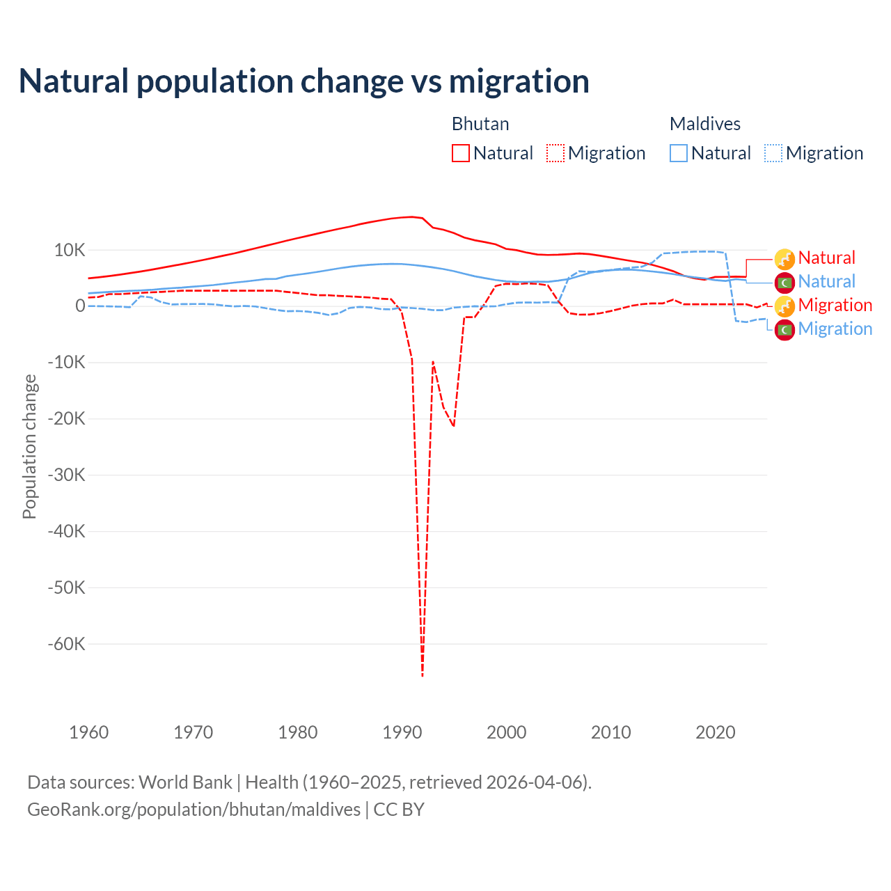 Over the last 10 years, 93.3% of the population change in Bhutan is from natural causes (a gain of 55,796 people) and 6.74% is from migration (a gain of 4,035 people). In Maldives 42.7% is from natural causes (a gain of 51,342 people) and 57.3% is from migration (a gain of 68,788 people).