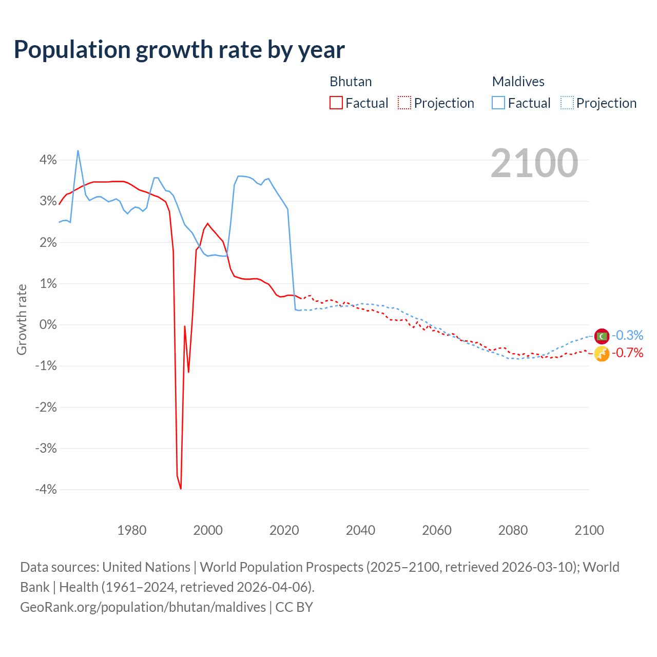 - For the last 10 years, Bhutan has had an average growth rate of +0.8% per year vs +2.56% in Maldives.