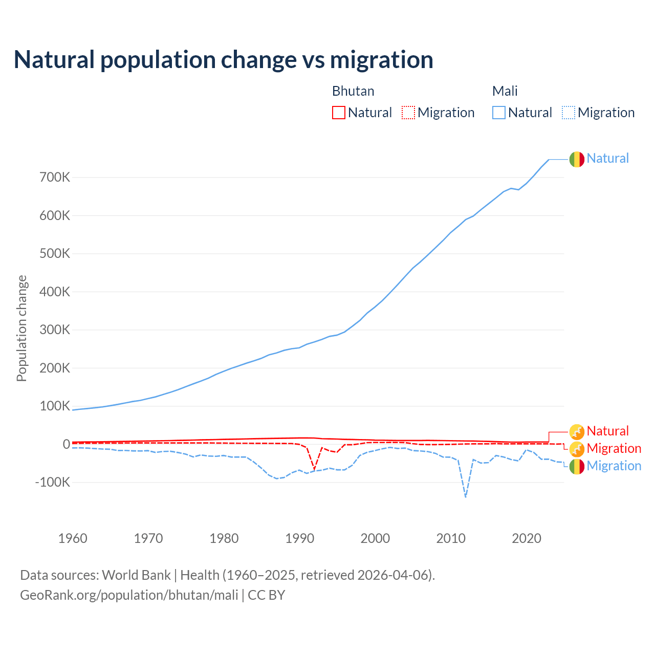 Over the last 10 years, 93.3% of the population change in Bhutan is from natural causes (a gain of 55,796 people) and 6.74% is from migration (a gain of 4,035 people). In Mali 94.9% is from natural causes (a gain of 6,749,473 people) and 5.13% is from migration (a loss of 365,292 people).