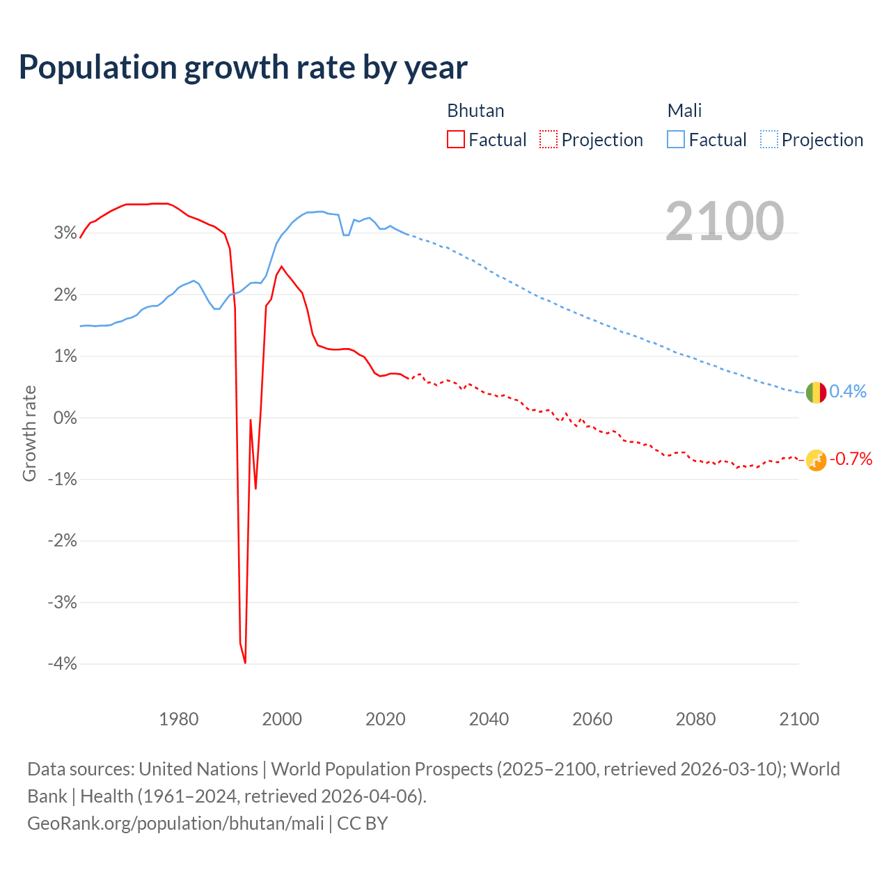 - For the last 10 years, Bhutan has had an average growth rate of +0.8% per year vs +3.12% in Mali.