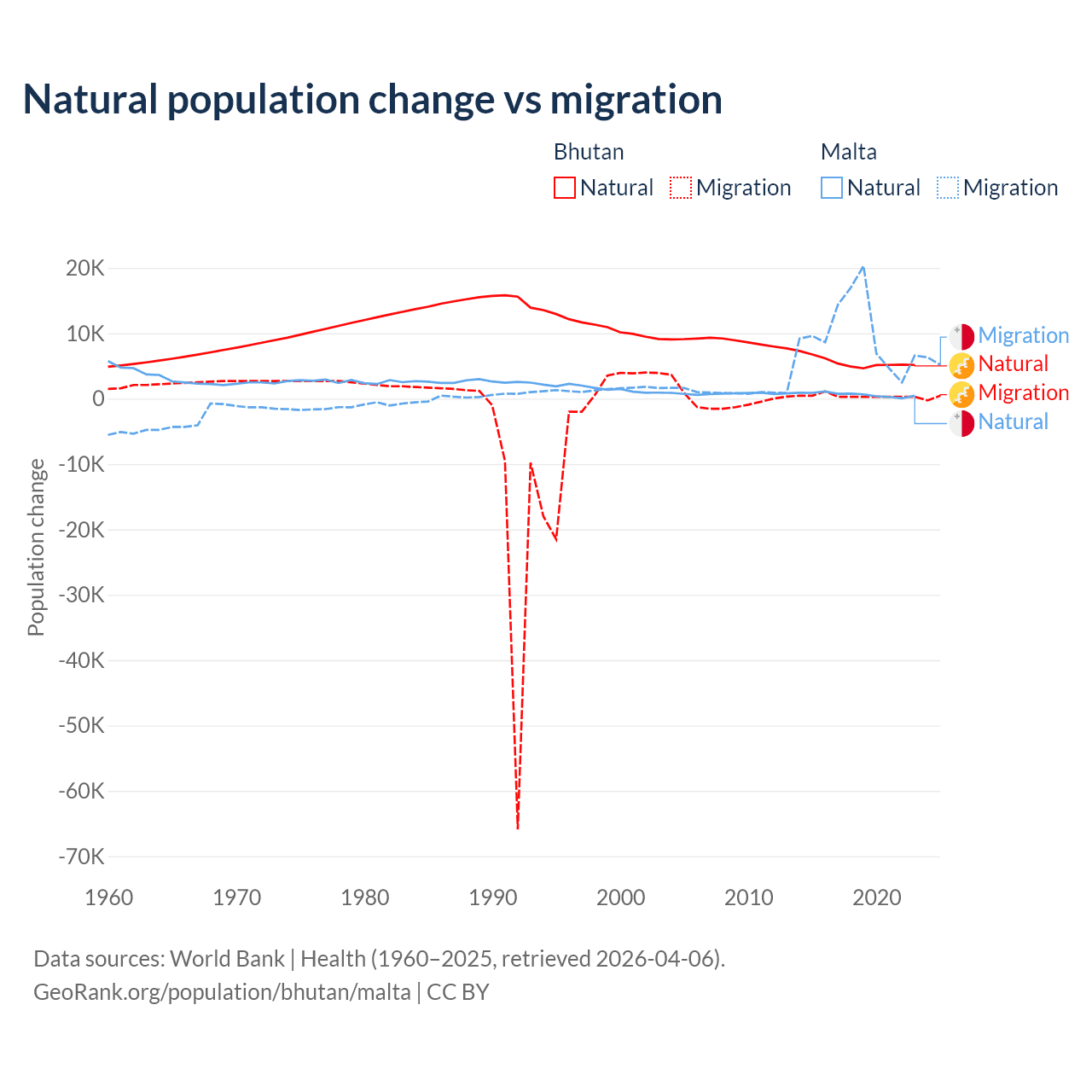 Over the last 10 years, 93.3% of the population change in Bhutan is from natural causes (a gain of 55,796 people) and 6.74% is from migration (a gain of 4,035 people). In Malta 5.84% is from natural causes (a gain of 6,181 people) and 94.2% is from migration (a gain of 99,652 people).