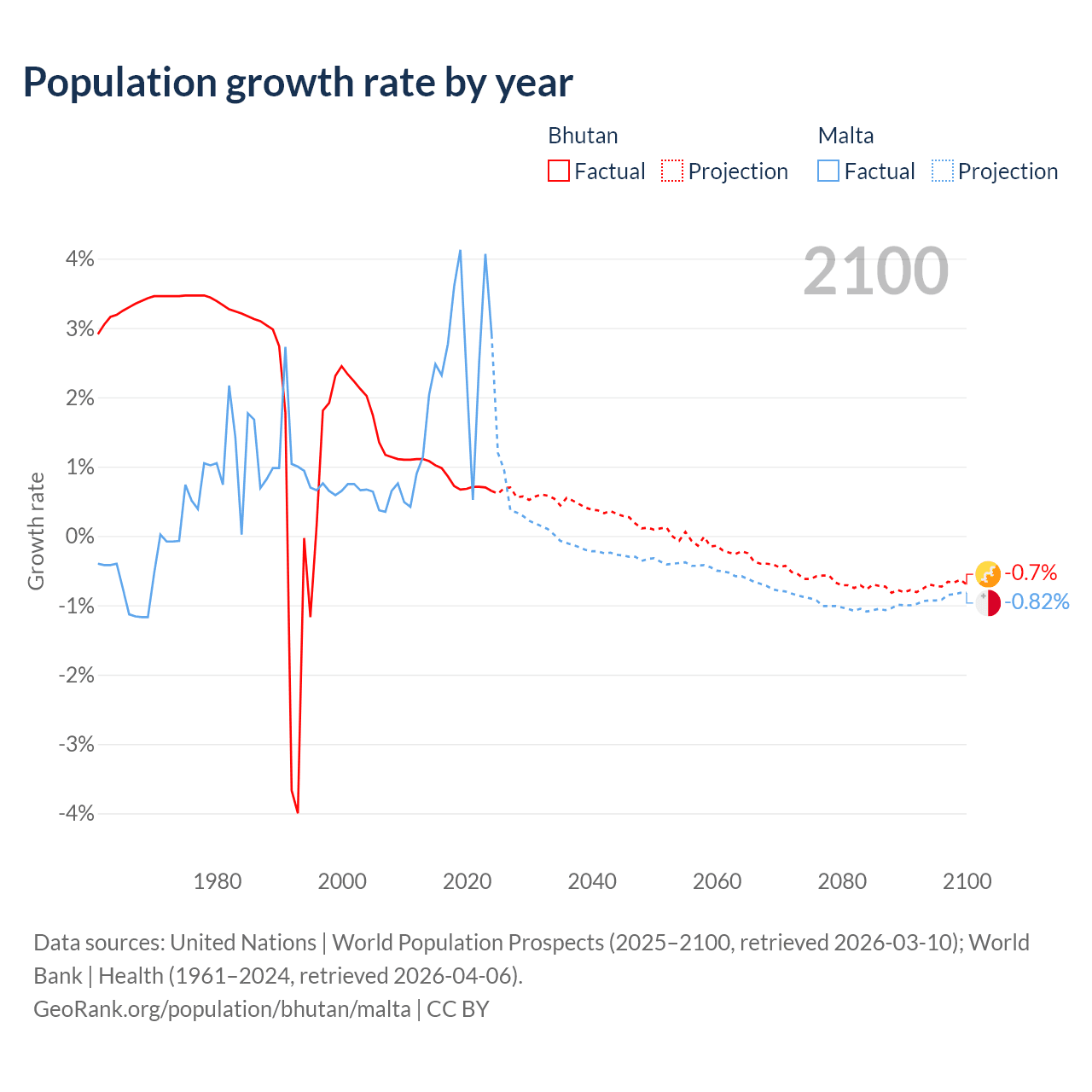 - For the last 10 years, Bhutan has had an average growth rate of +0.8% per year vs +2.69% in Malta.