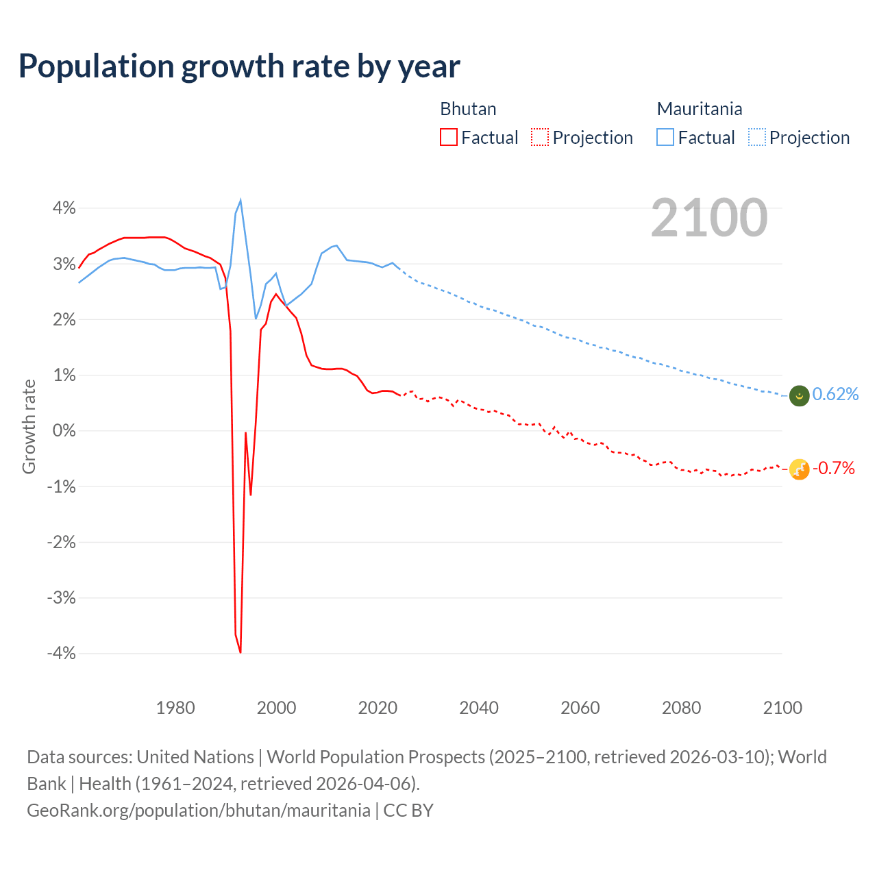 - For the last 10 years, Bhutan has had an average growth rate of +0.8% per year vs +3% in Mauritania.