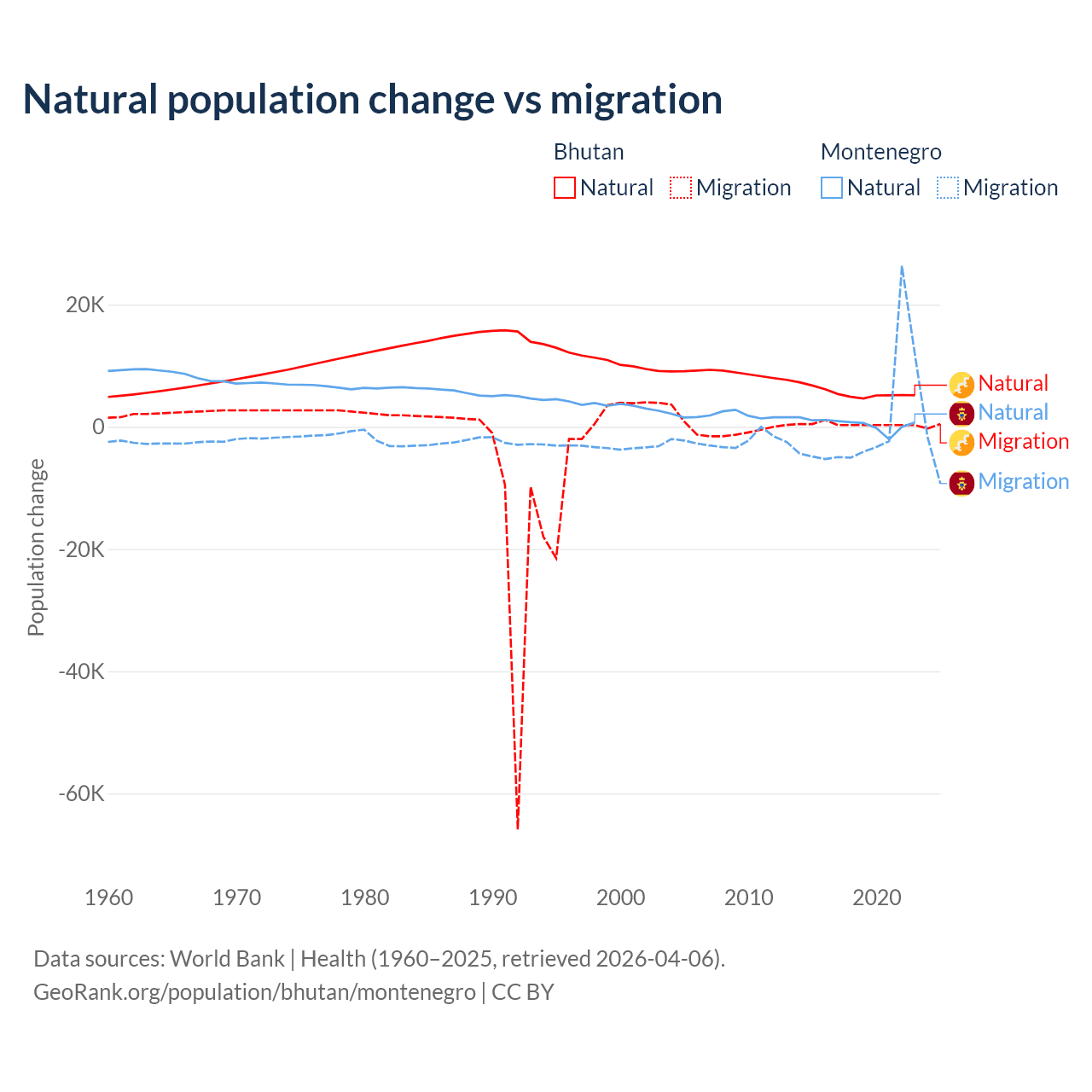 Over the last 10 years, 93.3% of the population change in Bhutan is from natural causes (a gain of 55,796 people) and 6.74% is from migration (a gain of 4,035 people). In Montenegro 52.4% is from natural causes (a gain of 4,501 people) and 47.6% is from migration (a gain of 4,095 people).