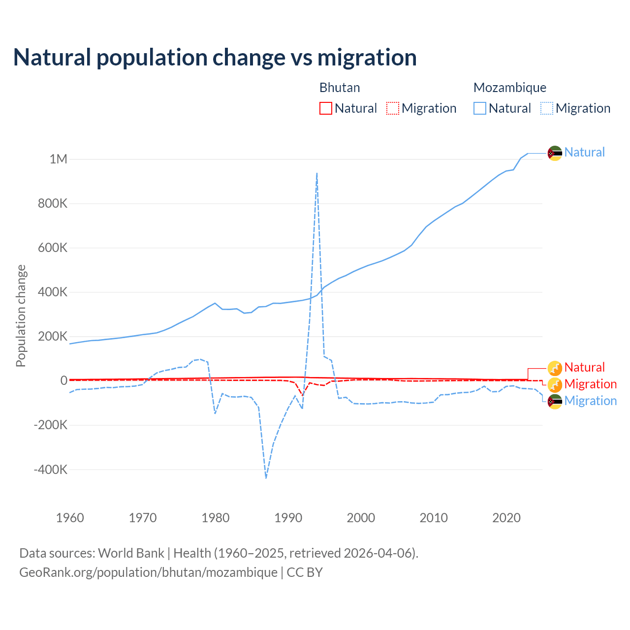 Over the last 10 years, 93.3% of the population change in Bhutan is from natural causes (a gain of 55,796 people) and 6.74% is from migration (a gain of 4,035 people). In Mozambique 95.9% is from natural causes (a gain of 9,108,203 people) and 4.15% is from migration (a loss of 393,923 people).