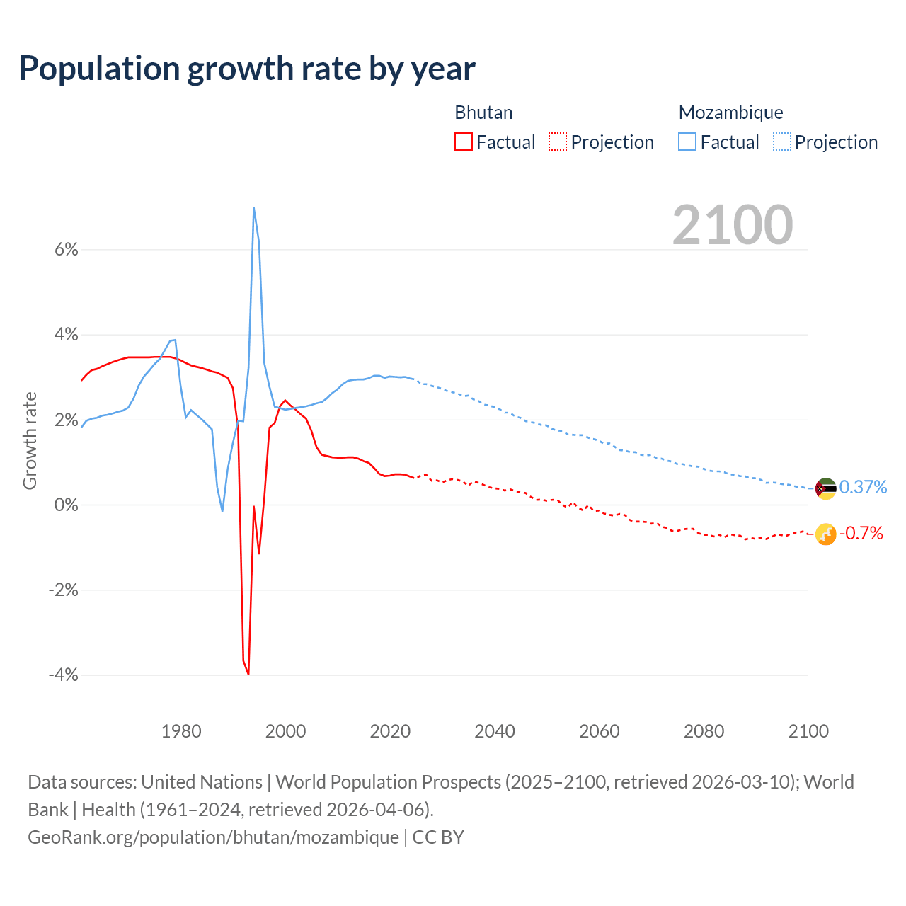 - For the last 10 years, Bhutan has had an average growth rate of +0.8% per year vs +2.99% in Mozambique.
