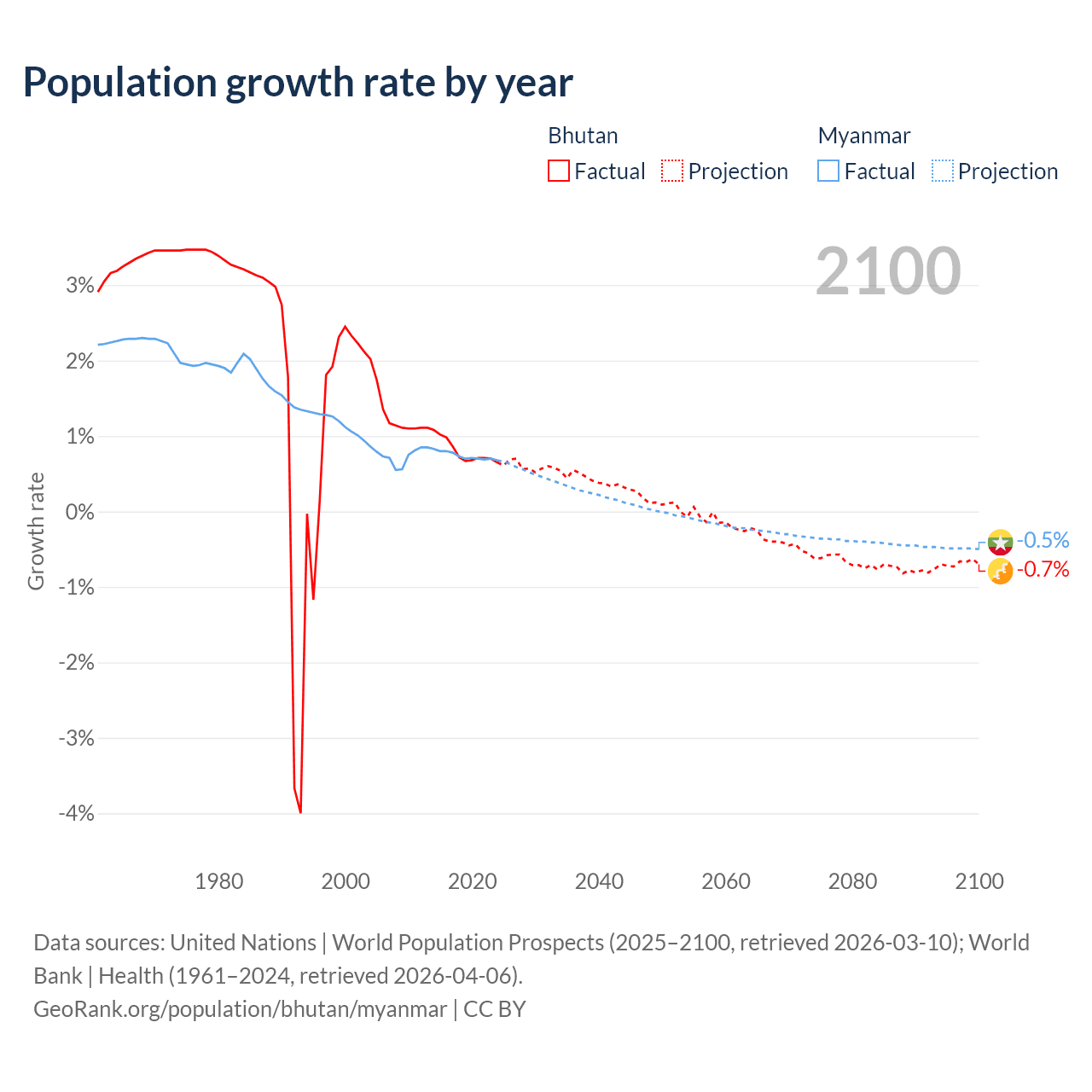 - For the last 10 years, Bhutan has had an average growth rate of +0.8% per year vs +0.74% in Myanmar.