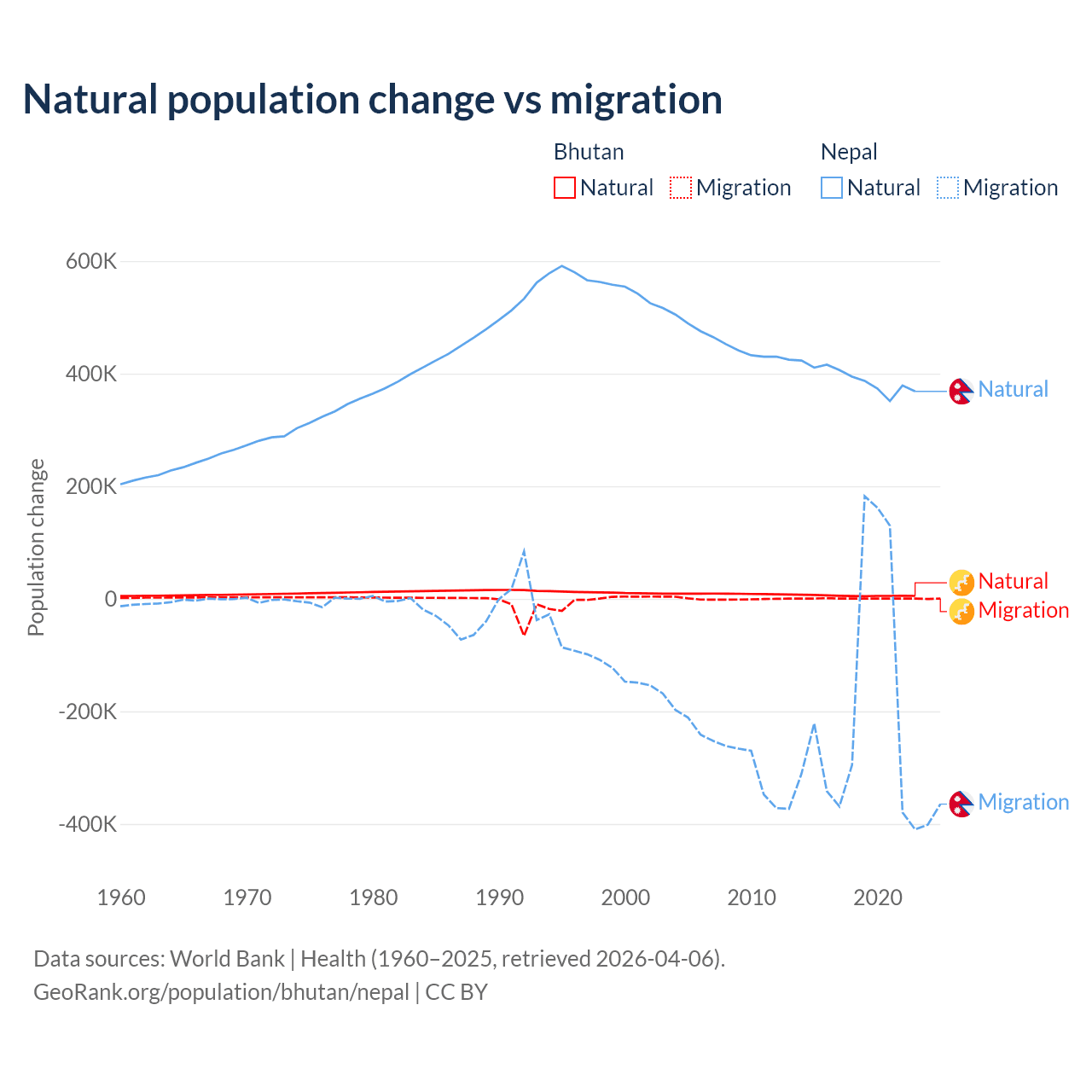 Over the last 10 years, 93.3% of the population change in Bhutan is from natural causes (a gain of 55,796 people) and 6.74% is from migration (a gain of 4,035 people). In Nepal 67.9% is from natural causes (a gain of 3,909,749 people) and 32.1% is from migration (a loss of 1,851,664 people).