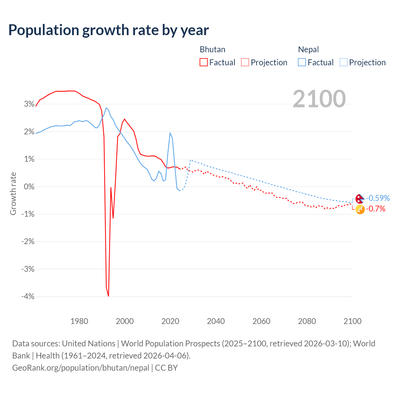 - For the last 10 years, Bhutan has had an average growth rate of +0.8% per year vs +0.66% in Nepal.