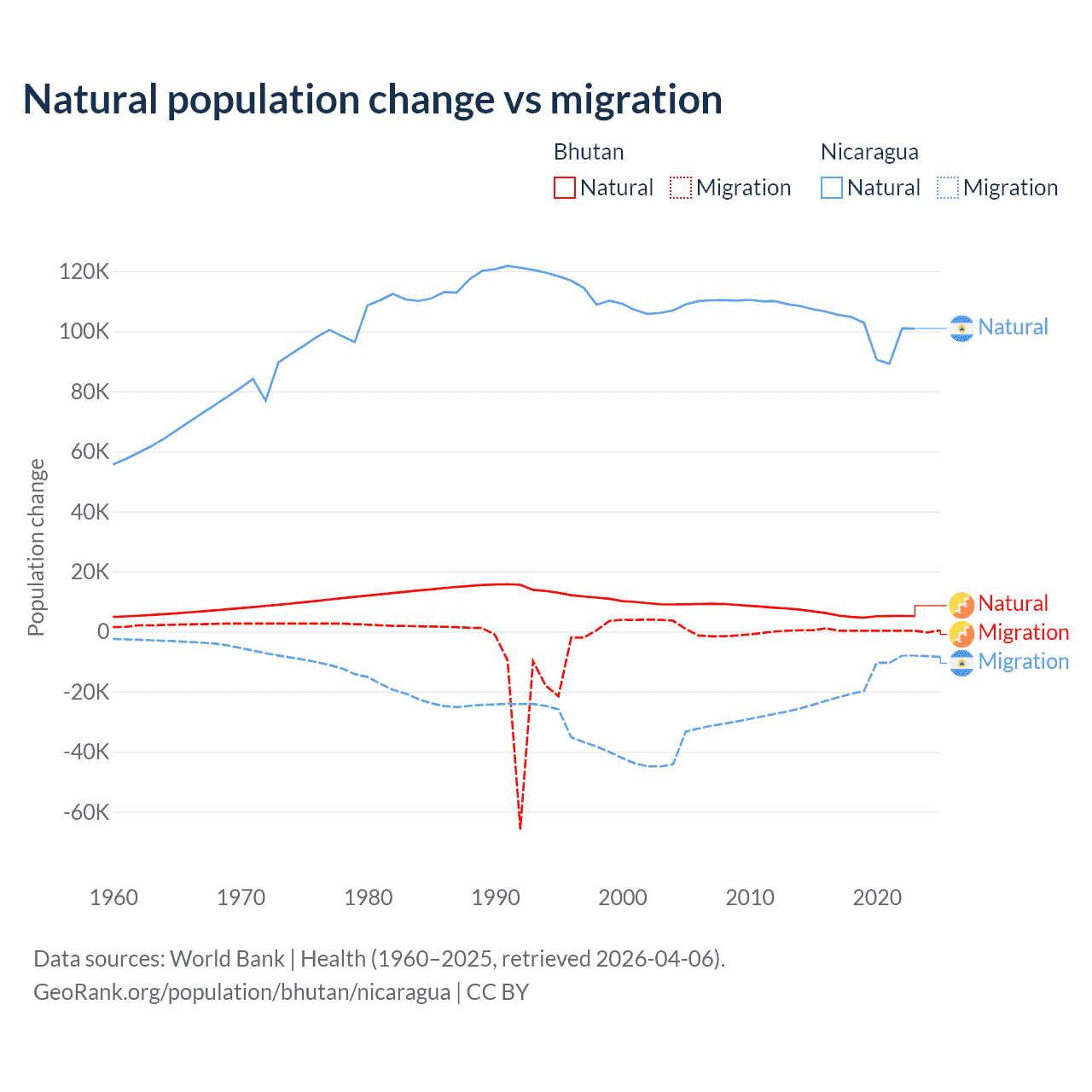 Over the last 10 years, 93.3% of the population change in Bhutan is from natural causes (a gain of 55,796 people) and 6.74% is from migration (a gain of 4,035 people). In Nicaragua 85.5% is from natural causes (a gain of 1,017,084 people) and 14.5% is from migration (a loss of 172,078 people).