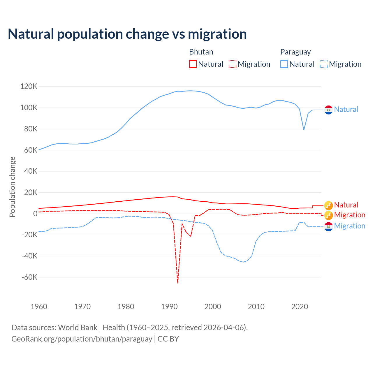 Over the last 10 years, 93.3% of the population change in Bhutan is from natural causes (a gain of 55,796 people) and 6.74% is from migration (a gain of 4,035 people). In Paraguay 87.6% is from natural causes (a gain of 1,002,636 people) and 12.4% is from migration (a loss of 141,377 people).