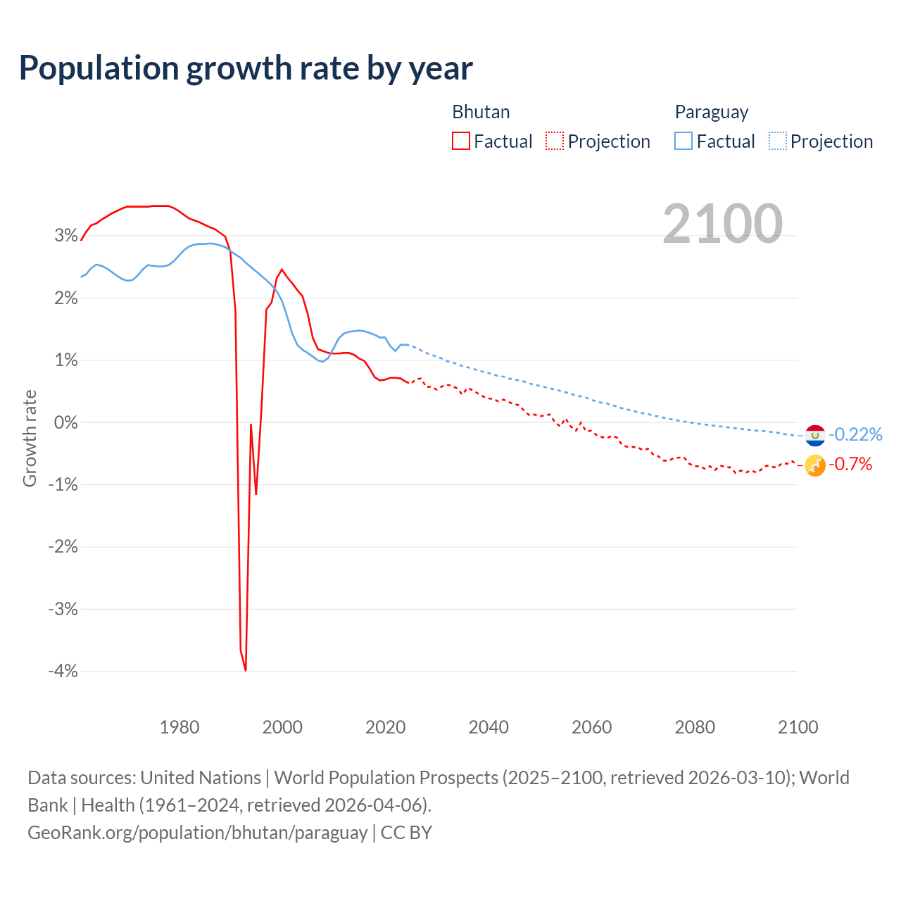 - For the last 10 years, Bhutan has had an average growth rate of +0.8% per year vs +1.34% in Paraguay.
