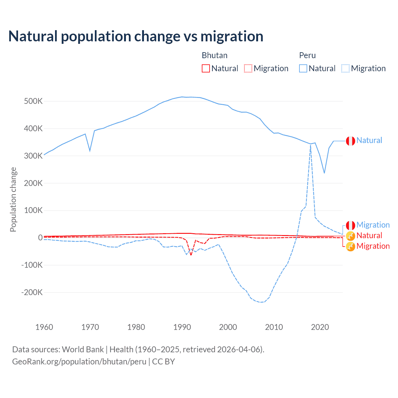 Over the last 10 years, 93.3% of the population change in Bhutan is from natural causes (a gain of 55,796 people) and 6.74% is from migration (a gain of 4,035 people). In Peru 82% is from natural causes (a gain of 3,345,822 people) and 18% is from migration (a gain of 732,505 people).