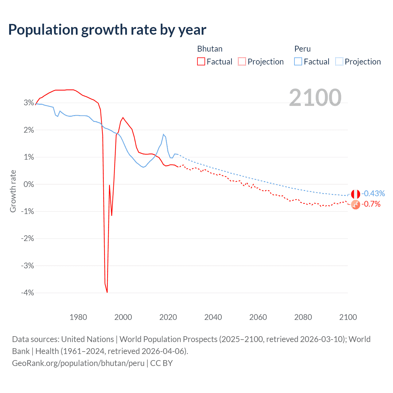 - For the last 10 years, Bhutan has had an average growth rate of +0.8% per year vs +1.26% in Peru.