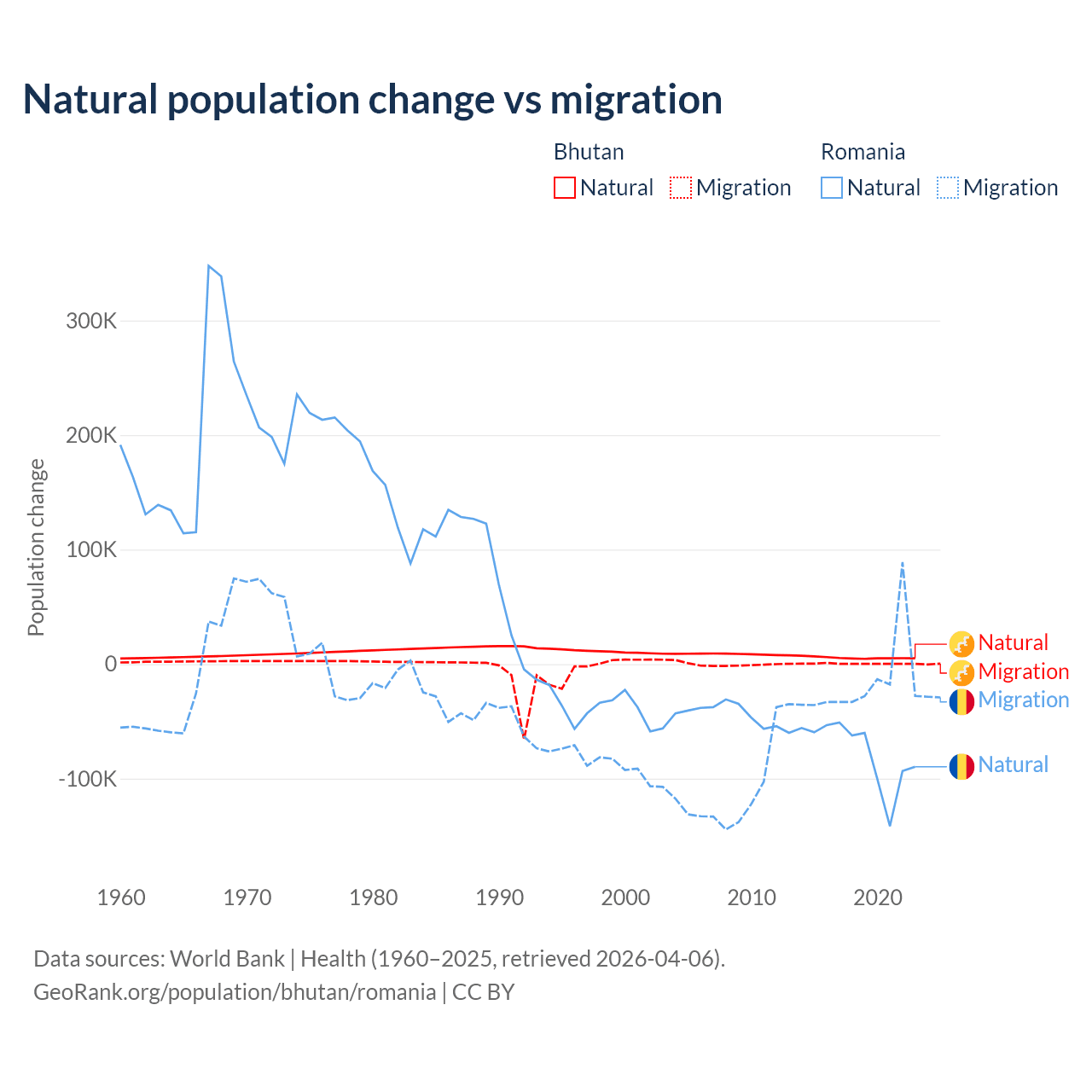 Over the last 10 years, 93.3% of the population change in Bhutan is from natural causes (a gain of 55,796 people) and 6.74% is from migration (a gain of 4,035 people). In Romania 82% is from natural causes (a loss of 766,295 people) and 18% is from migration (a loss of 167,917 people).