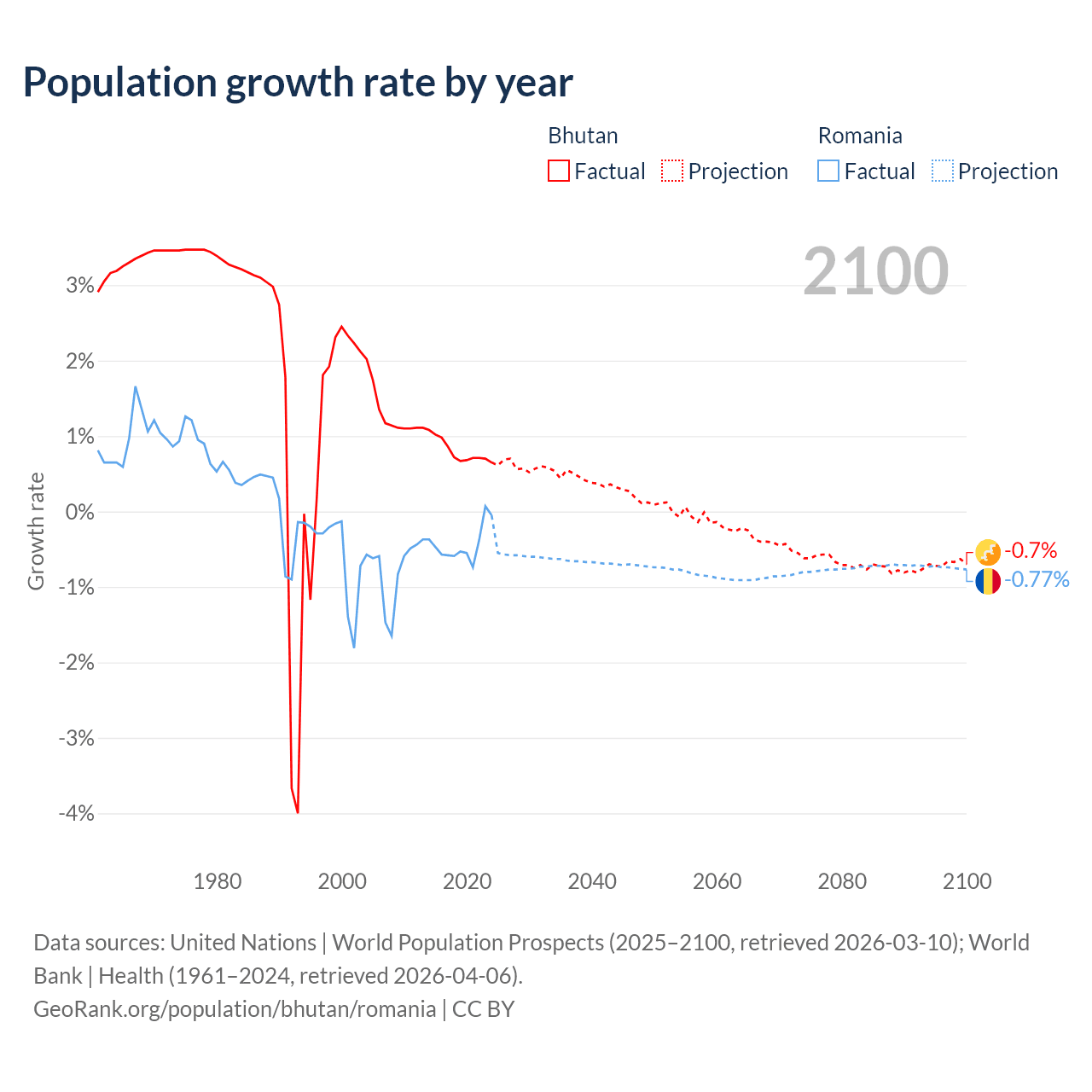 - For the last 10 years, Bhutan has had an average growth rate of +0.8% per year vs -0.43% in Romania.