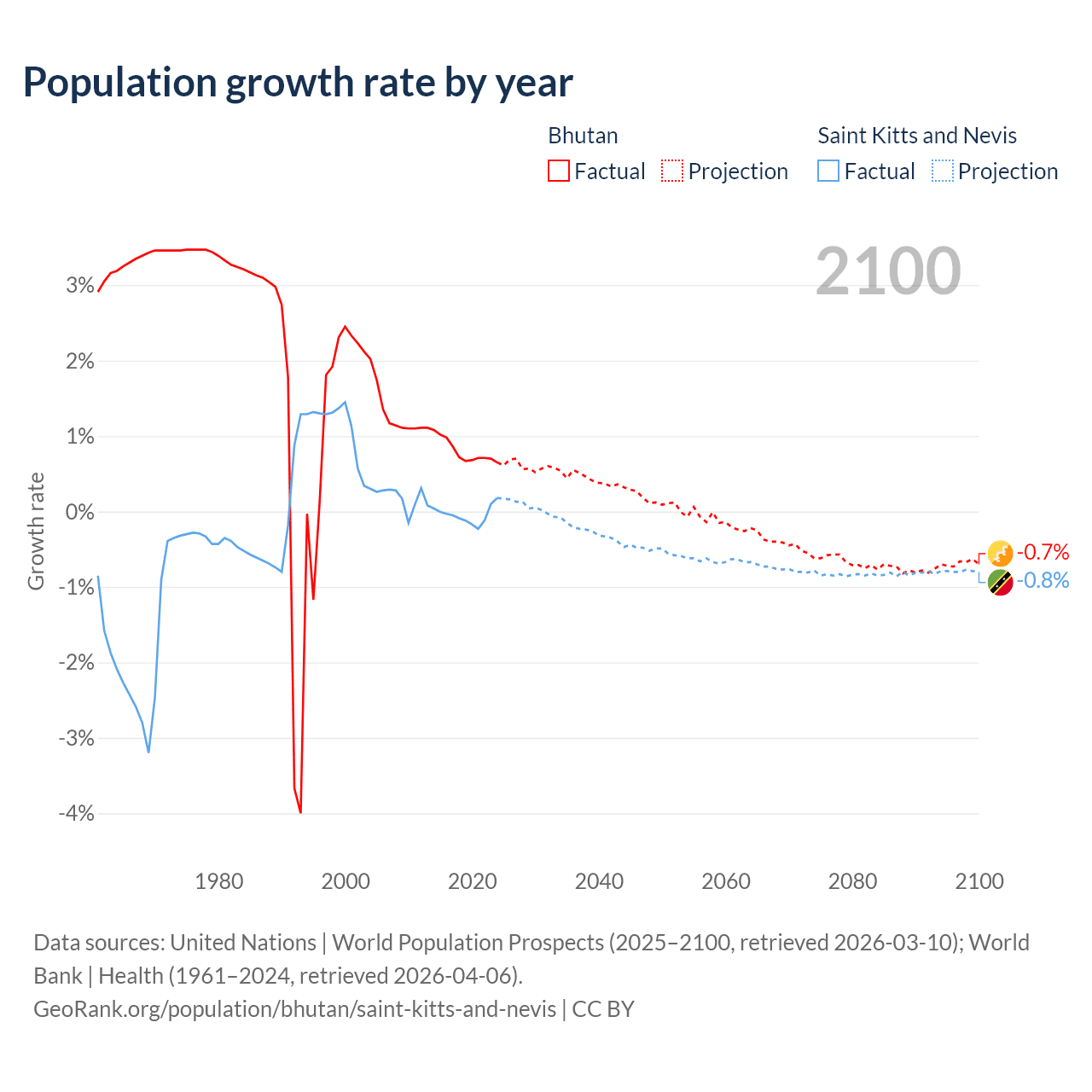 - For the last 10 years, Bhutan has had an average growth rate of +0.8% per year vs -0.04% in Saint Kitts and Nevis.