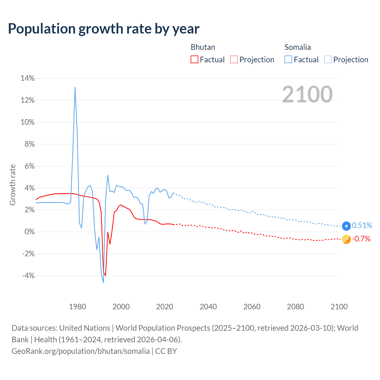 - For the last 10 years, Bhutan has had an average growth rate of +0.8% per year vs +3.61% in Somalia.