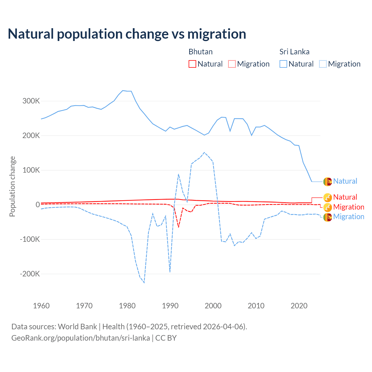 Over the last 10 years, 93.3% of the population change in Bhutan is from natural causes (a gain of 55,796 people) and 6.74% is from migration (a gain of 4,035 people). In Sri Lanka 85.3% is from natural causes (a gain of 1,605,749 people) and 14.7% is from migration (a loss of 276,121 people).