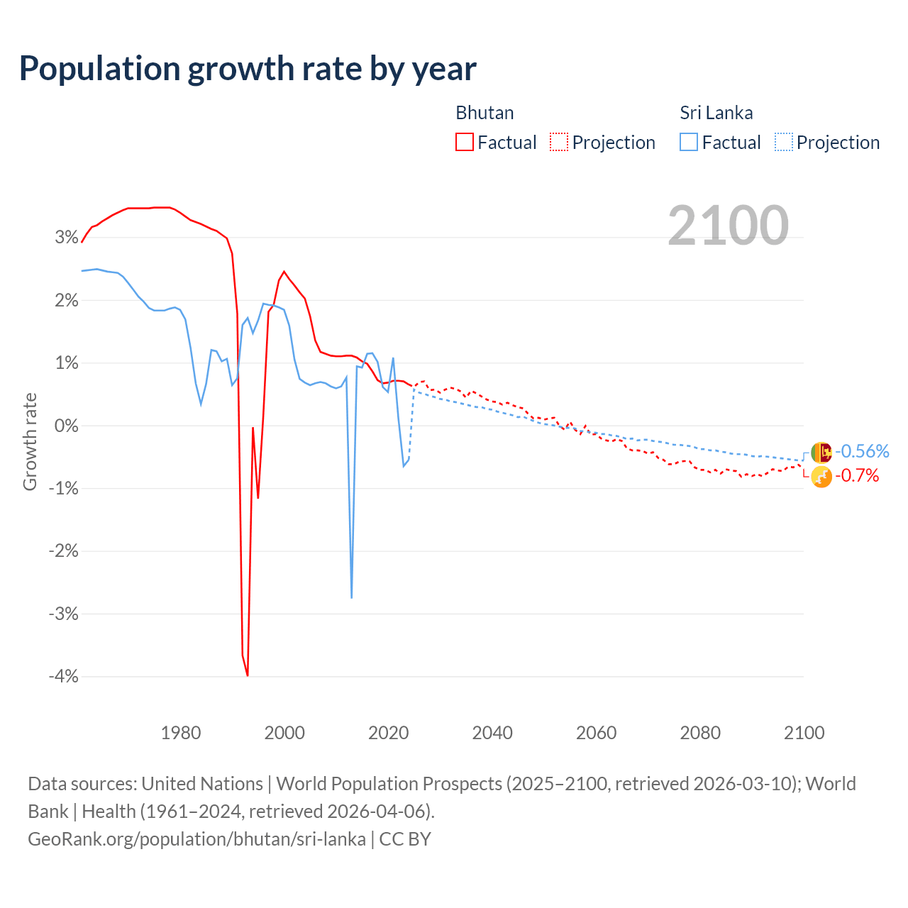 - For the last 10 years, Bhutan has had an average growth rate of +0.8% per year vs +0.57% in Sri Lanka.