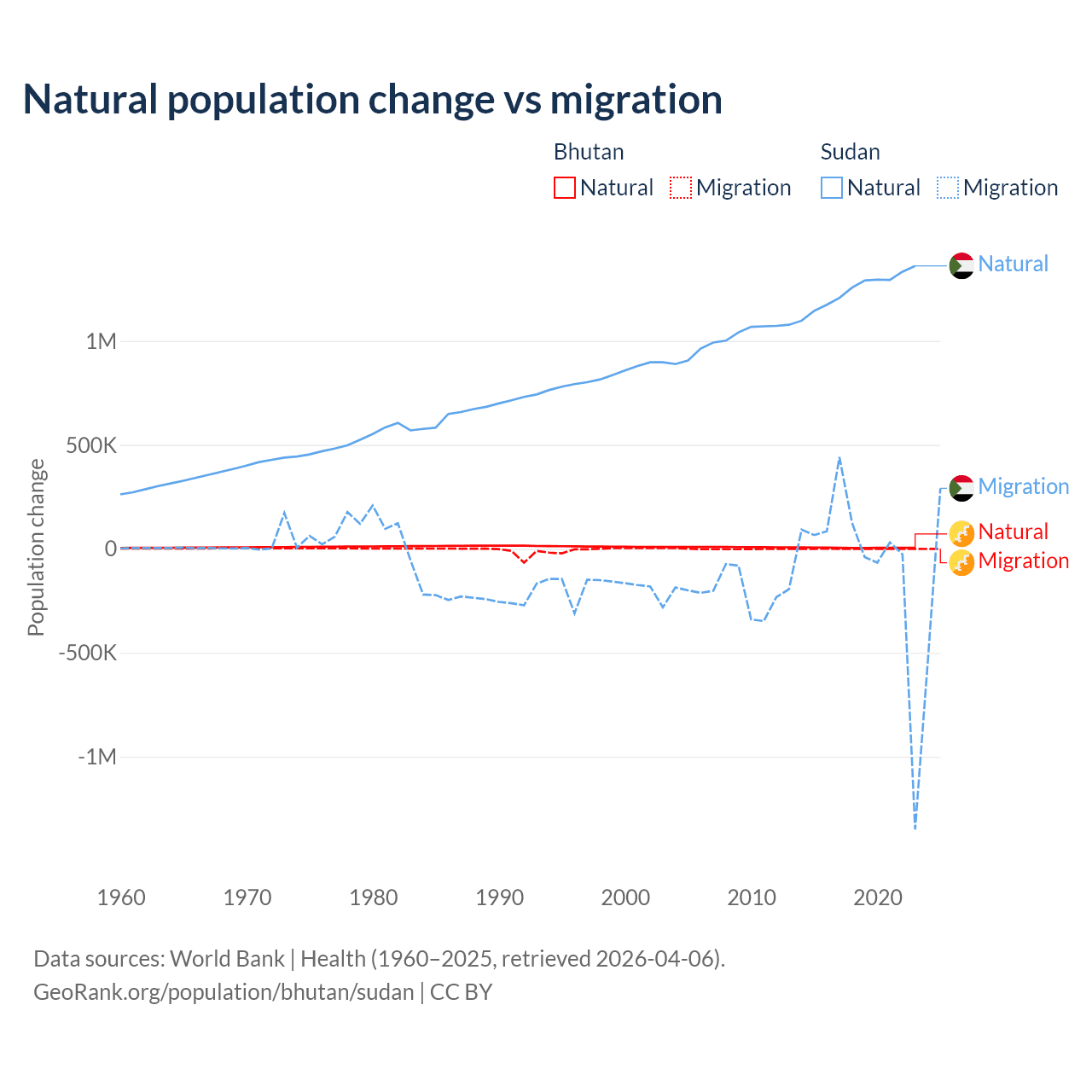 Over the last 10 years, 93.3% of the population change in Bhutan is from natural causes (a gain of 55,796 people) and 6.74% is from migration (a gain of 4,035 people). In Sudan 95.1% is from natural causes (a gain of 12,459,977 people) and 4.88% is from migration (a loss of 639,596 people).