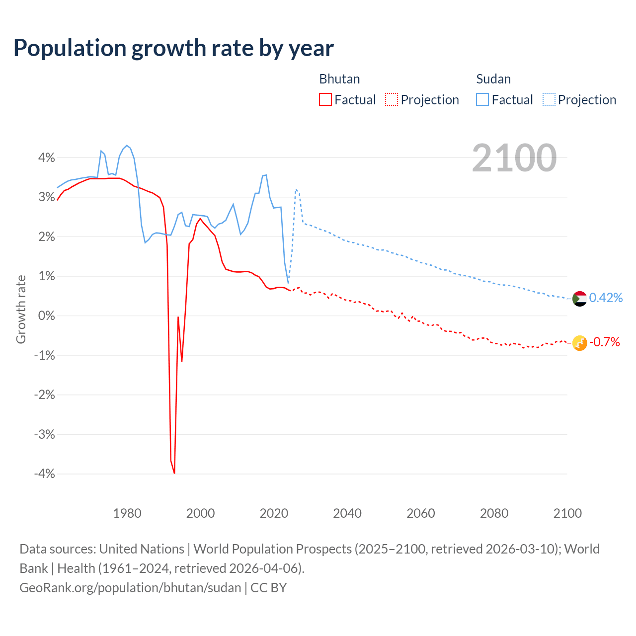 - For the last 10 years, Bhutan has had an average growth rate of +0.8% per year vs +2.67% in Sudan.