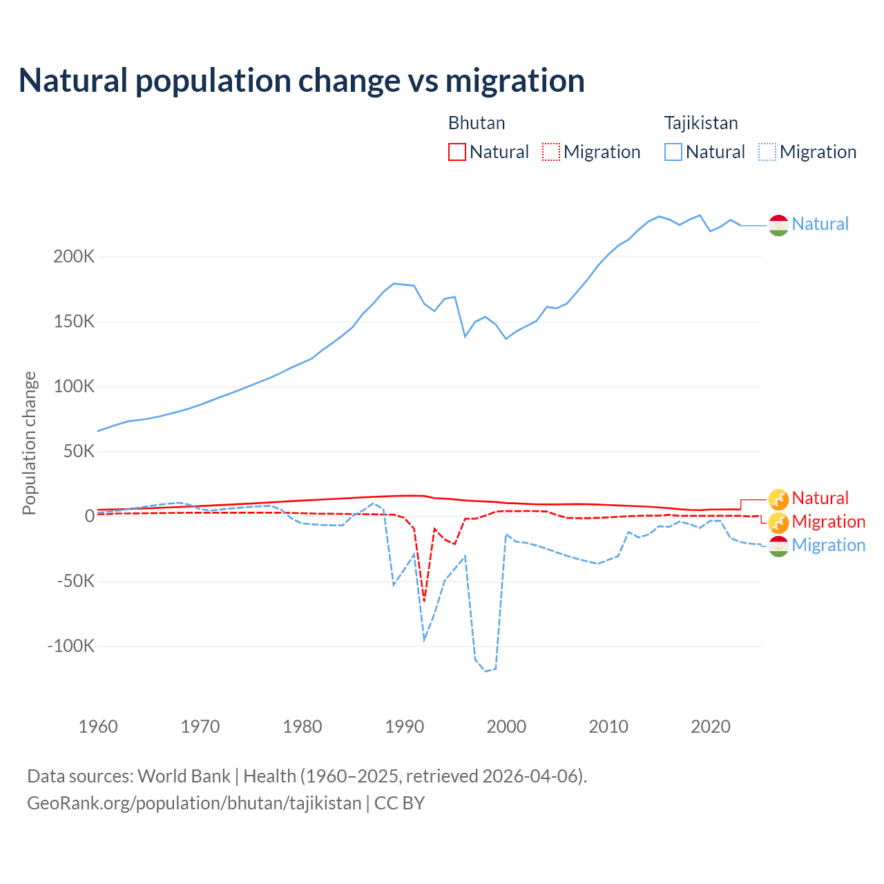 Over the last 10 years, 93.3% of the population change in Bhutan is from natural causes (a gain of 55,796 people) and 6.74% is from migration (a gain of 4,035 people). In Tajikistan 96% is from natural causes (a gain of 2,266,045 people) and 3.95% is from migration (a loss of 93,205 people).