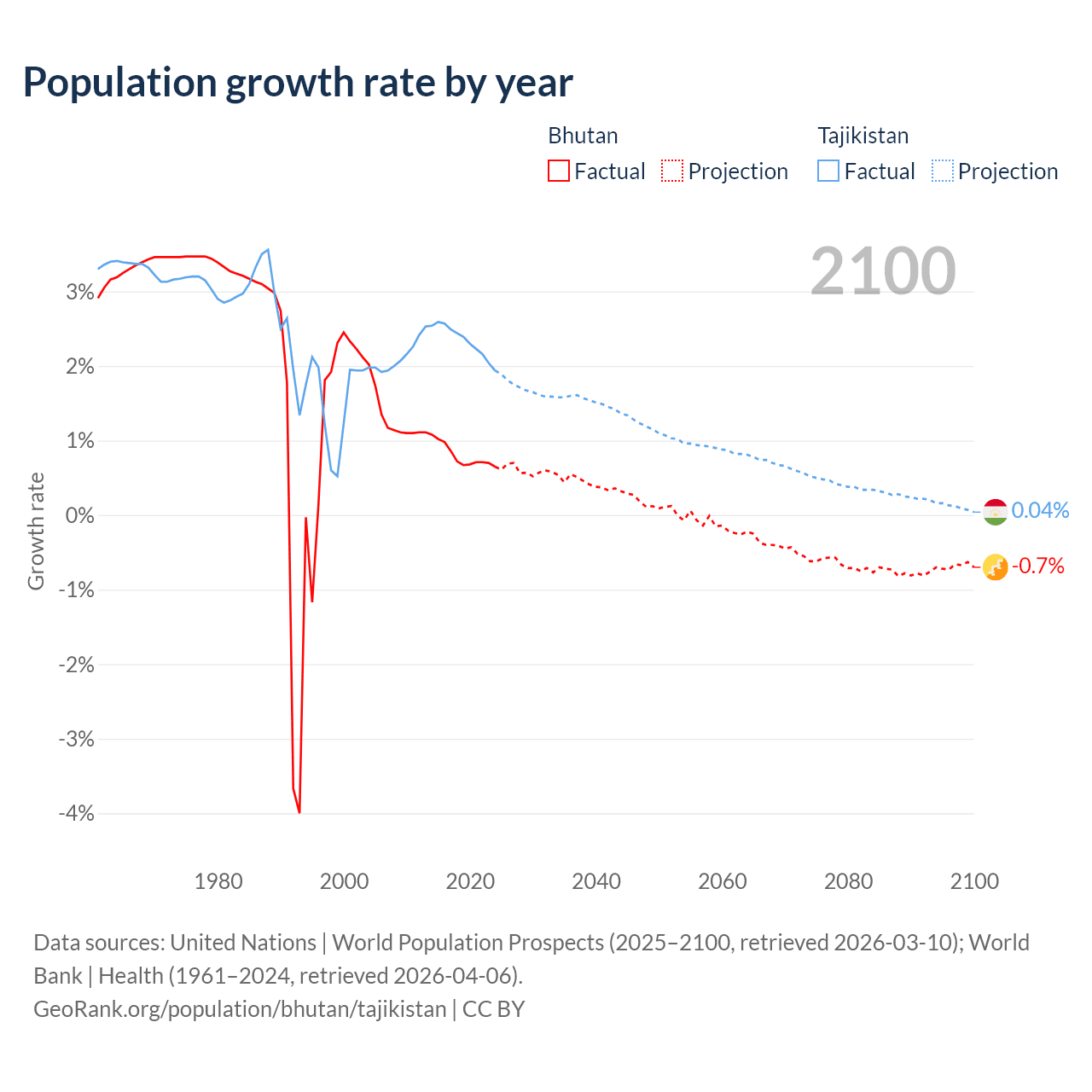 - For the last 10 years, Bhutan has had an average growth rate of +0.8% per year vs +2.33% in Tajikistan.