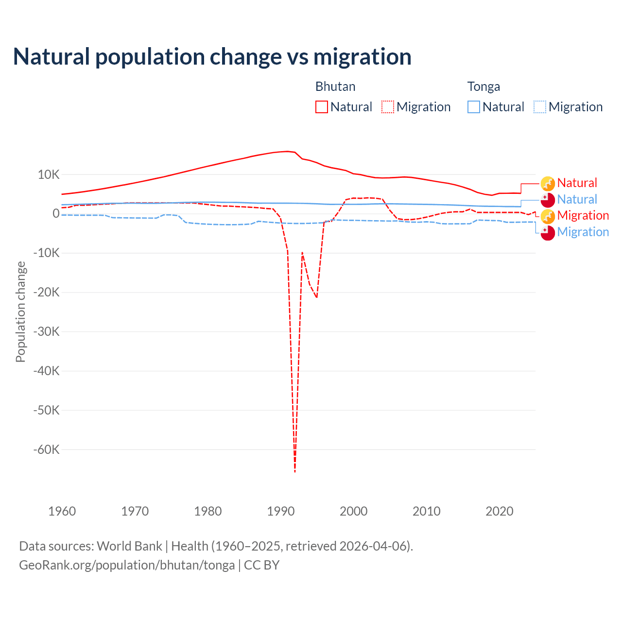 Over the last 10 years, 93.3% of the population change in Bhutan is from natural causes (a gain of 55,796 people) and 6.74% is from migration (a gain of 4,035 people). In Tonga 46.9% is from natural causes (a gain of 18,919 people) and 53.1% is from migration (a loss of 21,384 people).