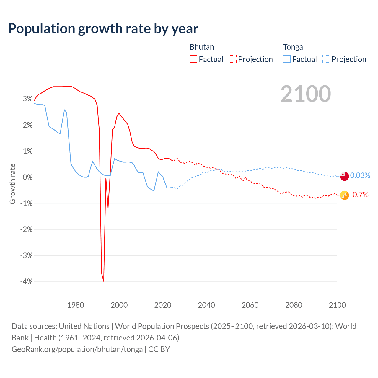 - For the last 10 years, Bhutan has had an average growth rate of +0.8% per year vs -0.25% in Tonga.