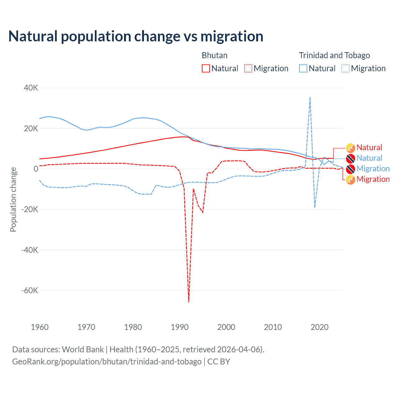 Over the last 10 years, 93.3% of the population change in Bhutan is from natural causes (a gain of 55,796 people) and 6.74% is from migration (a gain of 4,035 people). In Trinidad and Tobago 66% is from natural causes (a gain of 55,887 people) and 34% is from migration (a gain of 28,785 people).
