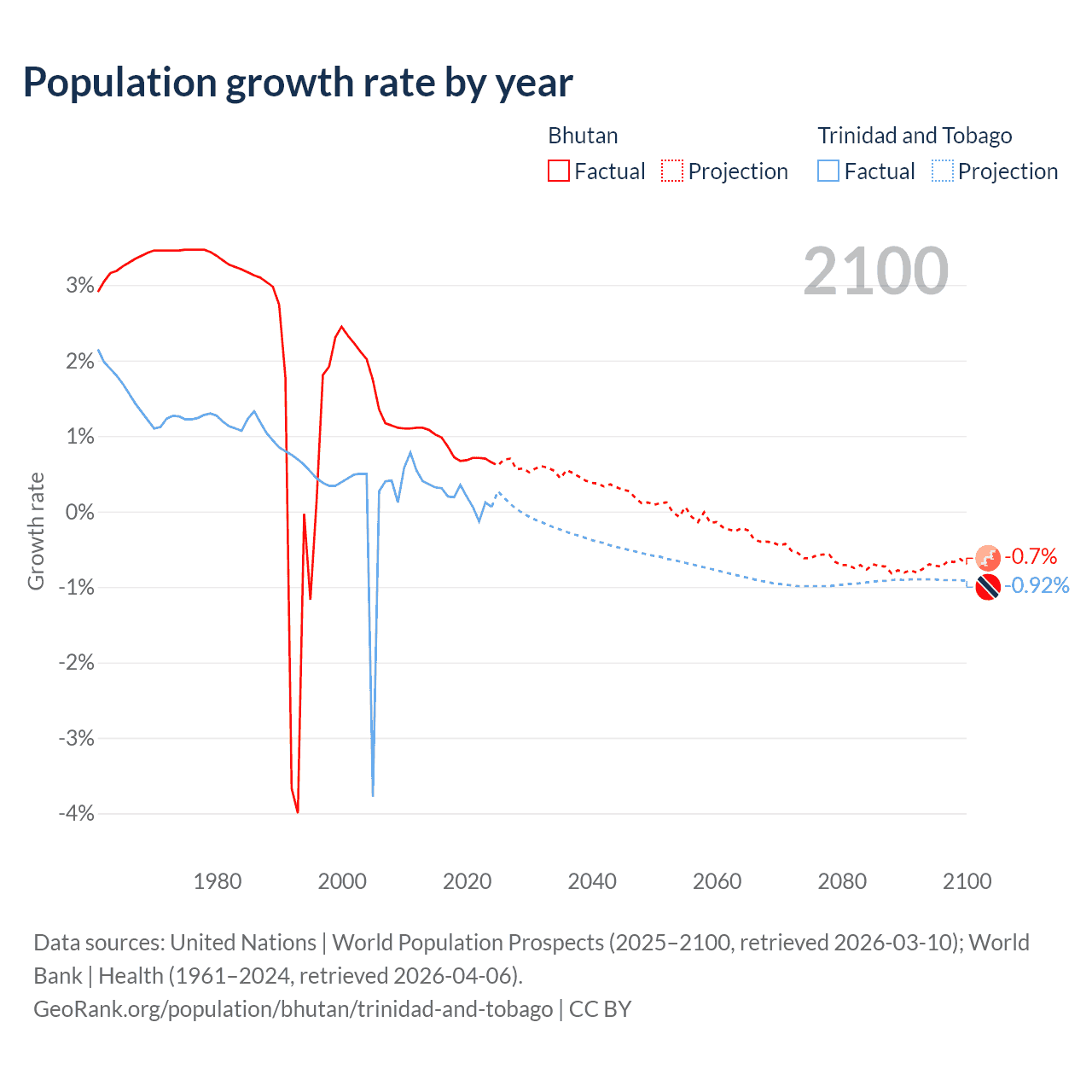 - For the last 10 years, Bhutan has had an average growth rate of +0.8% per year vs +0.19% in Trinidad and Tobago.
