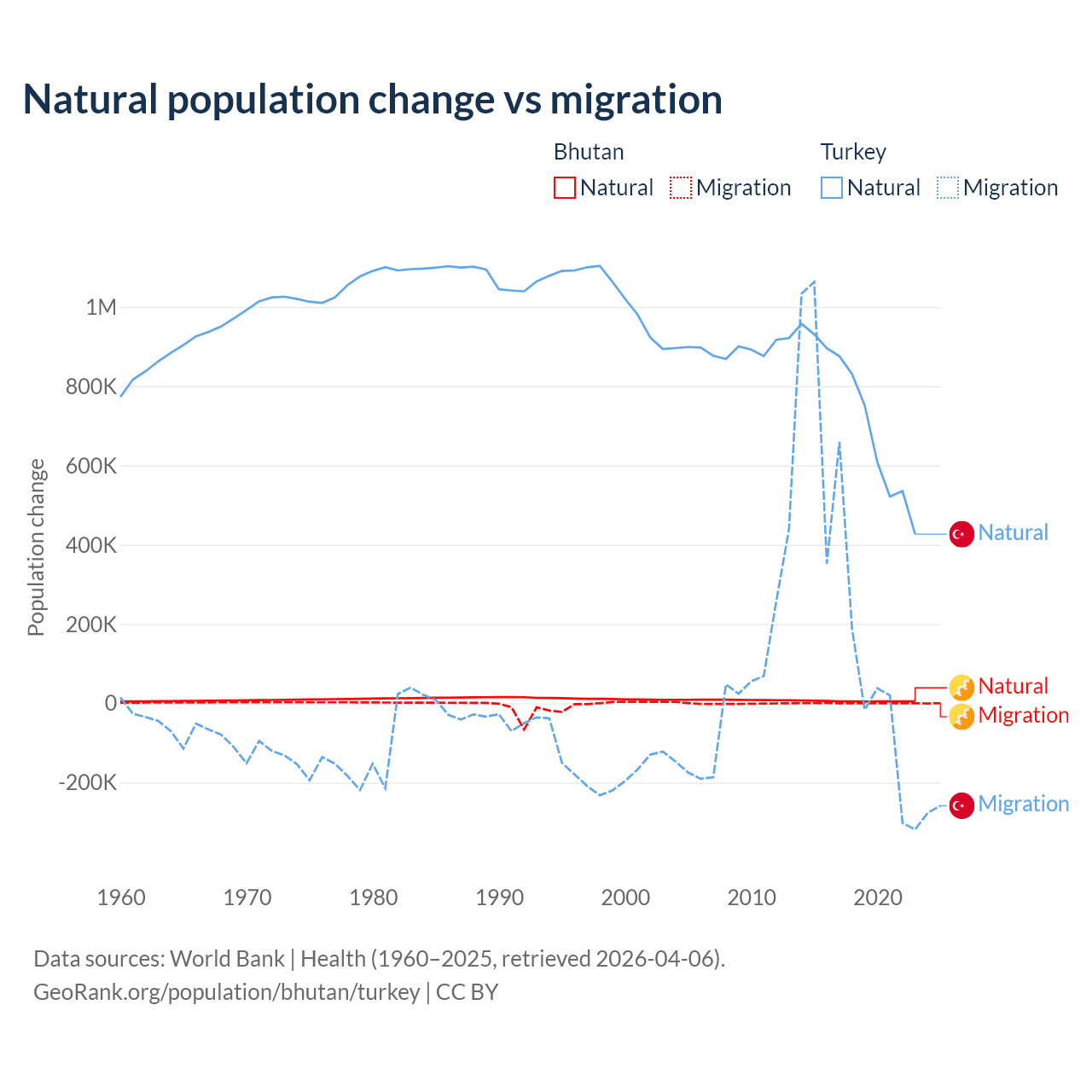 Over the last 10 years, 93.3% of the population change in Bhutan is from natural causes (a gain of 55,796 people) and 6.74% is from migration (a gain of 4,035 people). In Turkey 73% is from natural causes (a gain of 7,333,352 people) and 27% is from migration (a gain of 2,718,916 people).